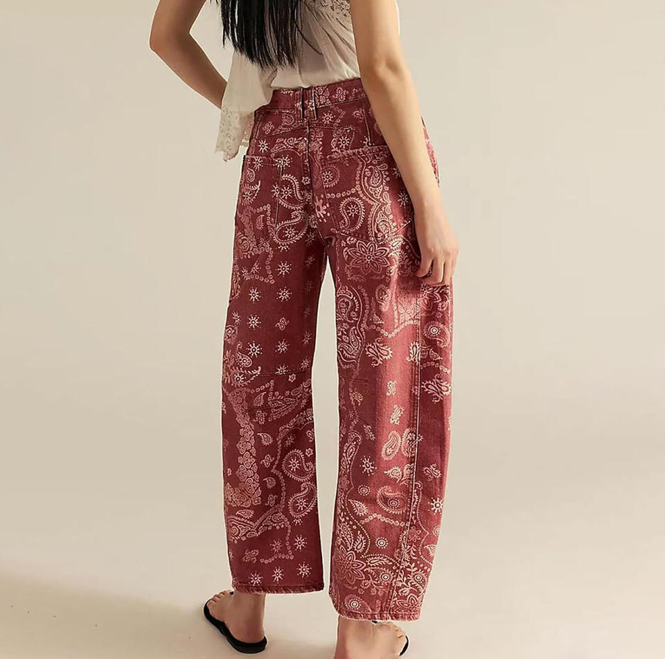 กางเกงยีนส์ขาทรงกระบอกพิมพ์ลาย Paisley สำหรับผู้หญิงสไตล์ตะวันตก