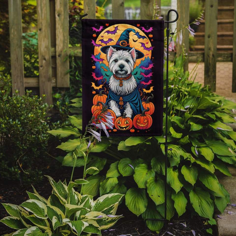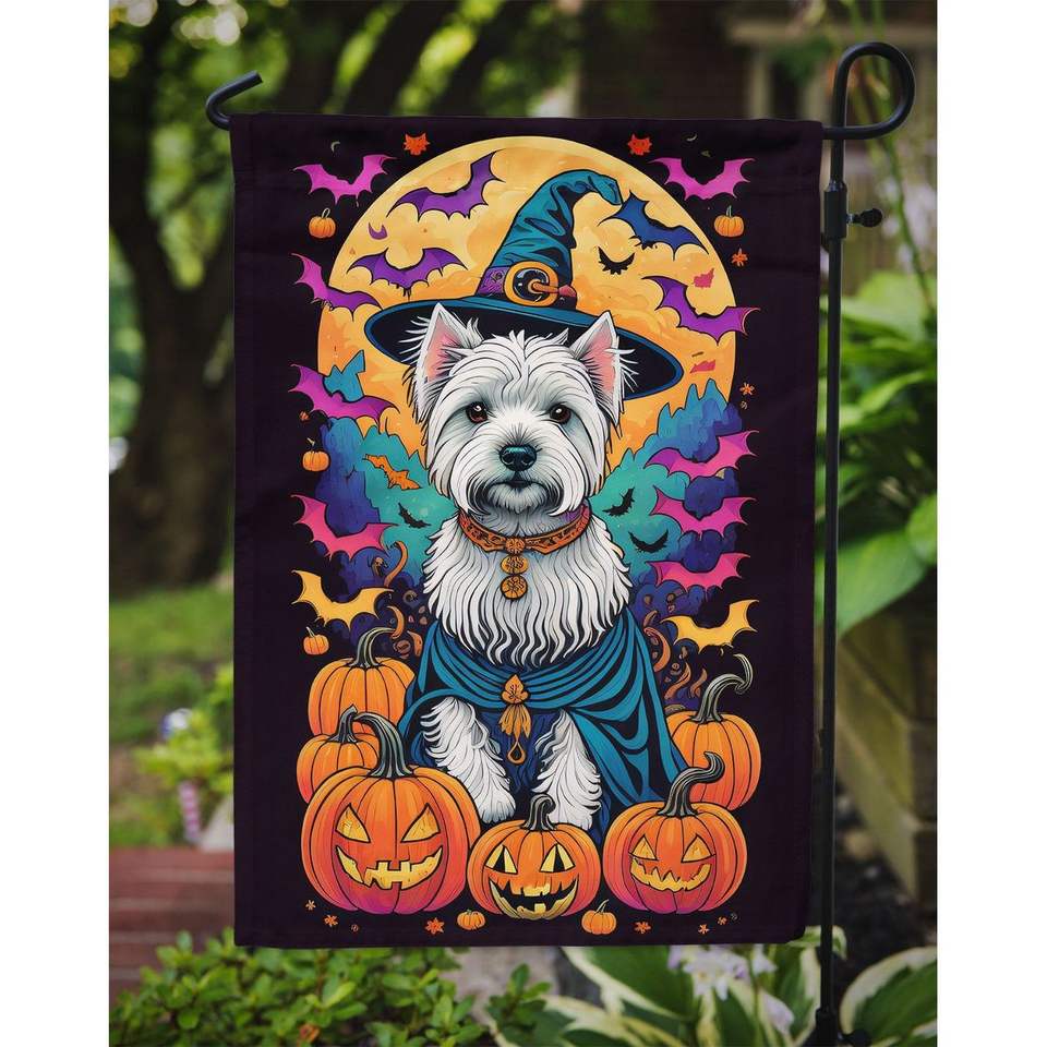 Westie Witchy ธงสวนฮาโลวีนหลากสีสำหรับตกแต่งกล่องจดหมายและลานแบนเนอร์สำหรับงานศิลปะในสวนและสนามหญ้าสำหรับเตียงดอกไม้