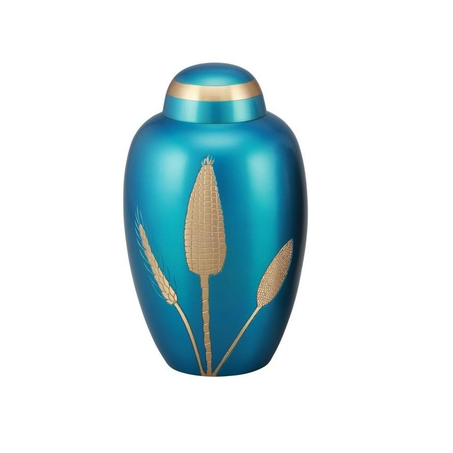การออกแบบข้าวสาลีโดมยอดโกศทองเหลืองสำหรับผู้ใหญ่ที่มีสีทองและสีฟ้าเคลือบสำหรับขี้เถ้า