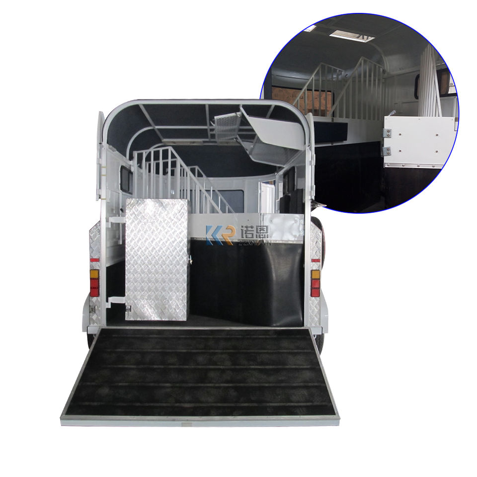 รถพ่วงสำหรับม้าแบบเพลาเดียว บรรทุกม้าได้ 2 ตัว พร้อมห้องพักอยู่อาศัย โครงสร้างเหล็ก ระบบเบรกแบบล้อเดียว สำหรับการขนส่งแบบ Angle Loading