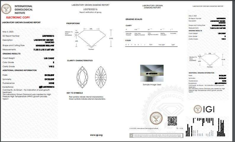 เพชรเม็ดเดี่ยวทรงมาร์คีส์สีขาว 1.50 กะรัต เพาะเลี้ยงในห้องปฏิบัติการ ขัดเงา สี E ความสะอาด VVS2 คุณภาพการเจียระไนเยี่ยม CVD รับรองโดย IGI เพชรหลวมขายส่ง