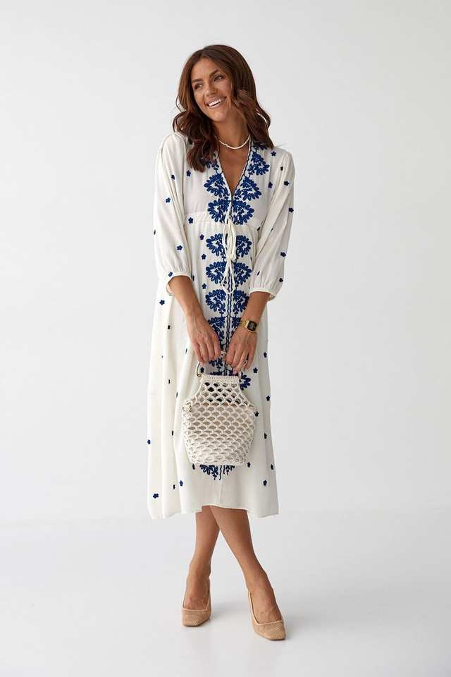 เดรสยาวทรงตรงผ้าฝ้ายสีขาว 100% สไตล์ลำลอง/เป็นทางการ ชายกระโปรงบาน ปักลายสีน้ำเงิน ซักได้
