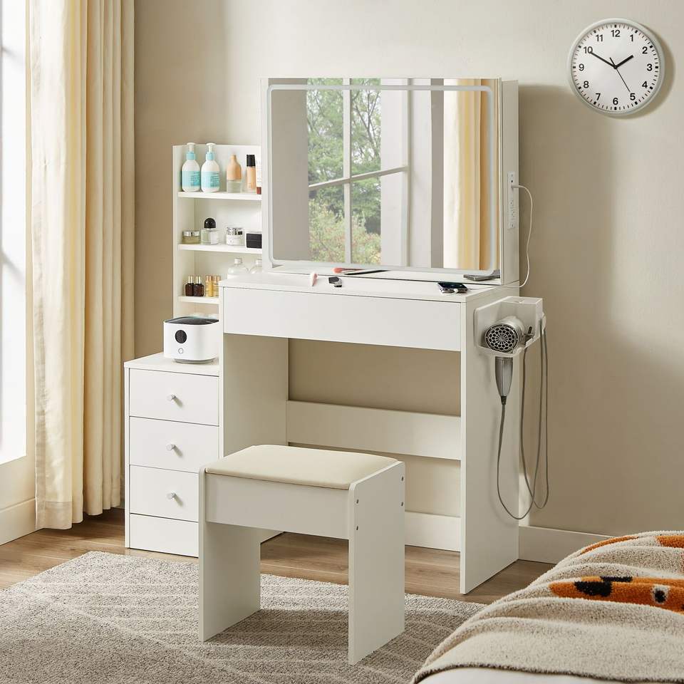 43.3สีขาว \ "L x 15.7 \" W x 55.4 \ "H ที่วางโต๊ะเครื่องแป้งกระจกไฟ LED-lit ที่วางไดร์เป่าผมที่เก็บของ4ลิ้นชัก