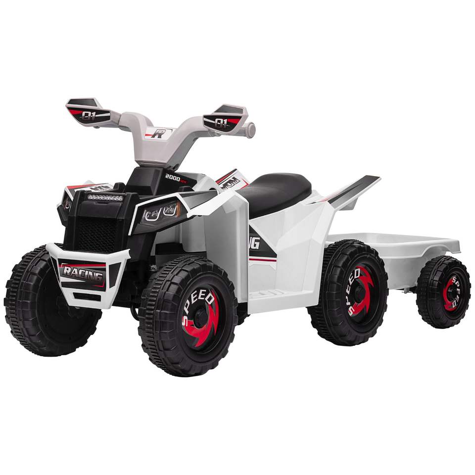 รถของเล่นไฟฟ้าสีขาว 6V สำหรับเด็กอายุ 18-36 เดือน พร้อมฟังก์ชั่นเดินหน้าและถอยหลัง ล้อทนทานต่อการสึกหรอ พร้อมที่ลากด้านหลัง