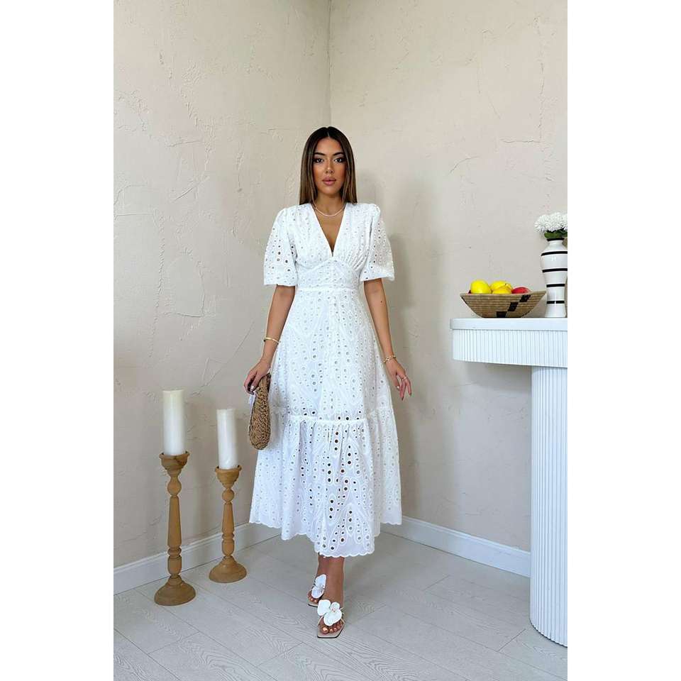 เดรสสีขาวทรงเอ คอวี ปักลาย เอวธรรมชาติ ผ้าทอ ระบายอากาศได้ดี สวมใส่สบายๆ
