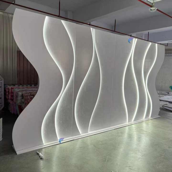 ฉากหลังอะคริลิคสีขาวพร้อมไฟ LED ติดผนังทรงโค้งสำหรับตกแต่งเวทีงานแต่งงาน
