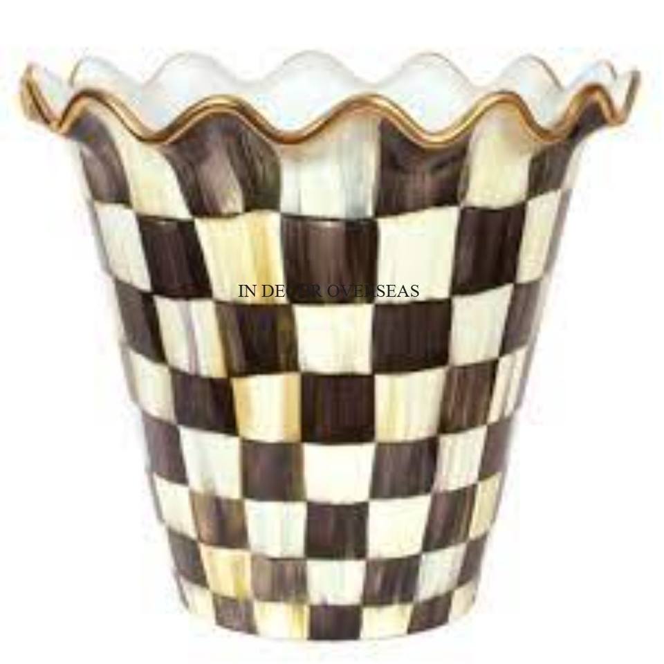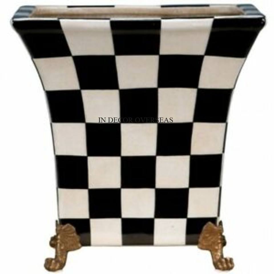 หม้อและกระถางต้นไม้โลหะเคลือบผงสีขาวและดำดีไซน์เนอร์พร้อมแท่นวางแฟนซีชุบทอง