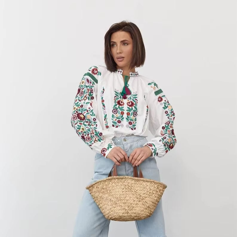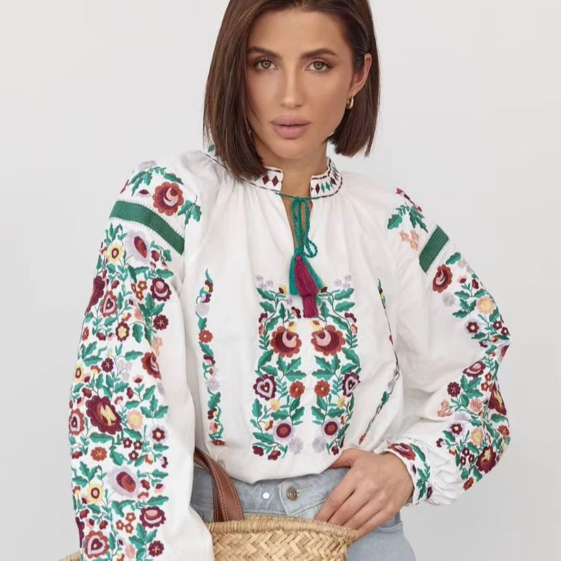 เสื้อเบลาส์วิสเพลย์ยูเครนทำด้วยมือเสื้อผ้าปักลายสีขาวแดงแบบดั้งเดิมของผู้หญิงเสื้อเบลาส์แนวเอวแบบธรรมชาติซักได้ของขวัญยูเครน