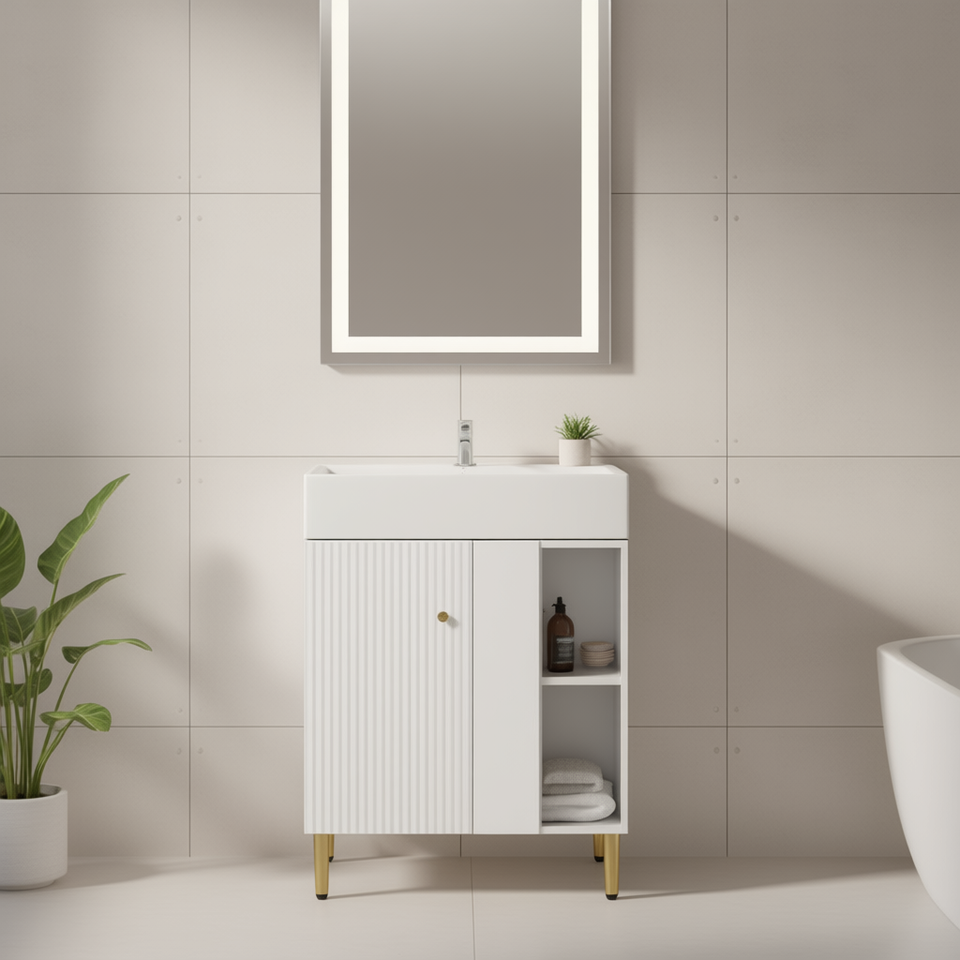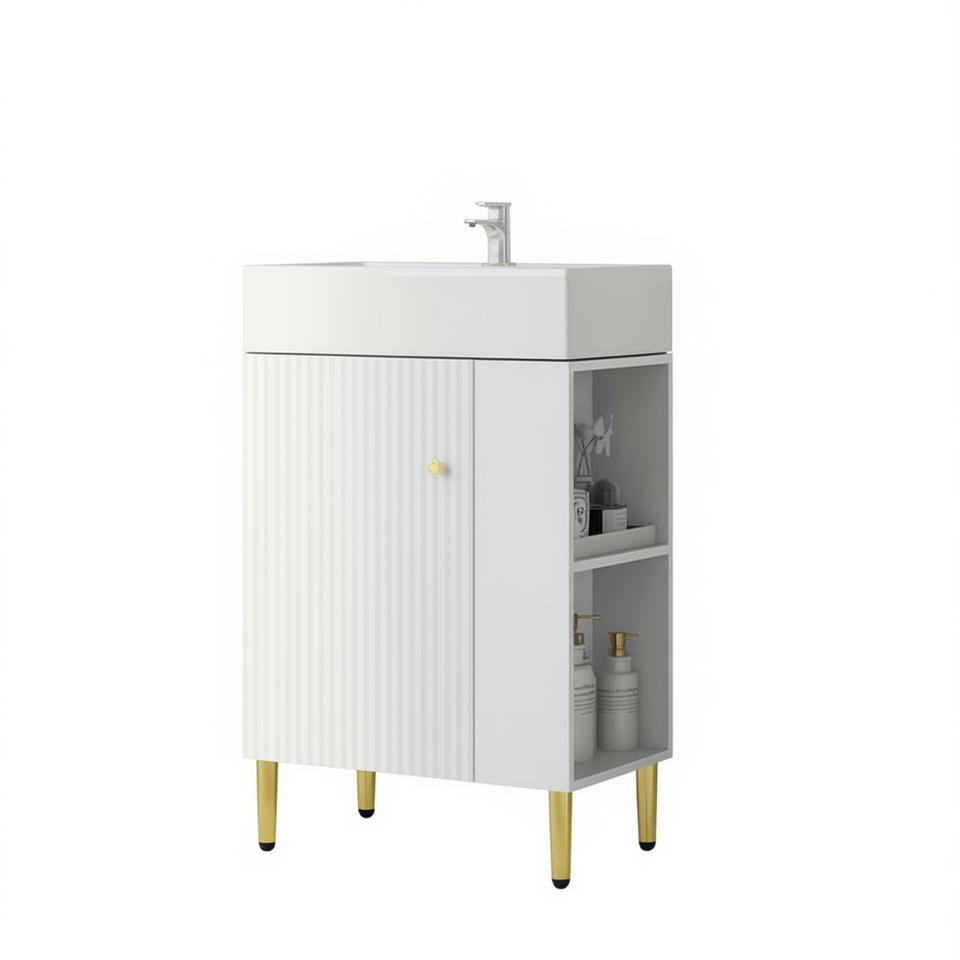 ตู้ห้องน้ำสีขาวพร้อมอ่างเซรามิกเดี่ยว ช่องเก็บของด้านขวา ขนาด 23 นิ้ว ตู้ตั้งพื้นสไตล์โมเดิร์นมินิมอล