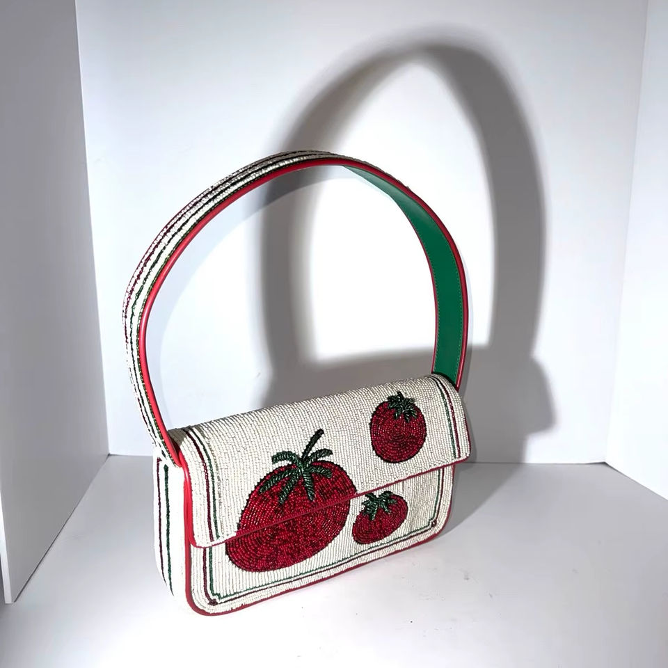 กระเป๋าสะพายไหล่ประดับลูกปัดสีขาว ปักลายมะเขือเทศสีแดง กระเป๋าถือลูกปัดแก้ว กระเป๋าคลัทช์ฤดูร้อนสำหรับสุภาพสตรี ลายผัก กระเป๋าถือแบบสะพายไหล่