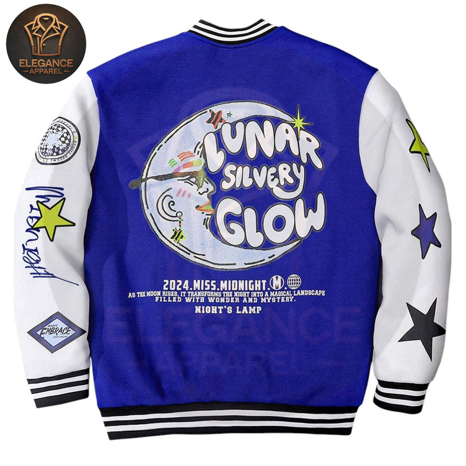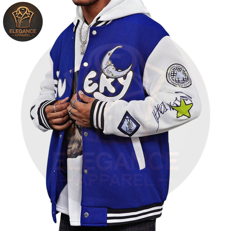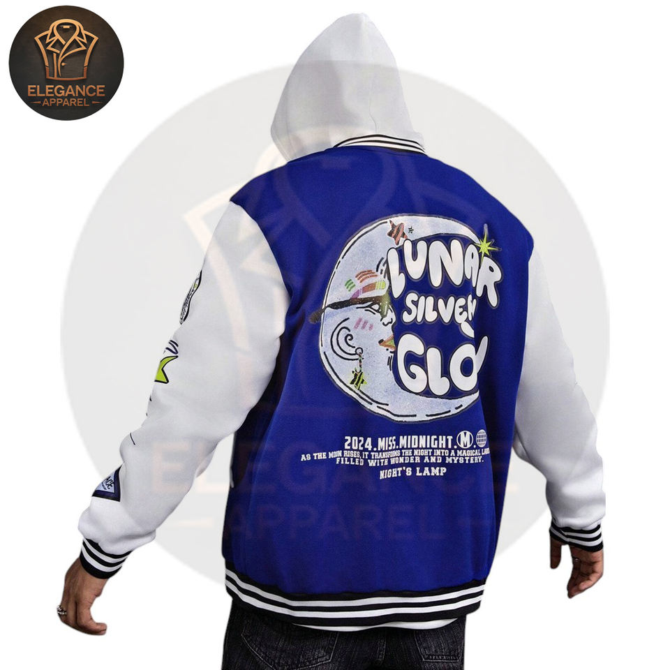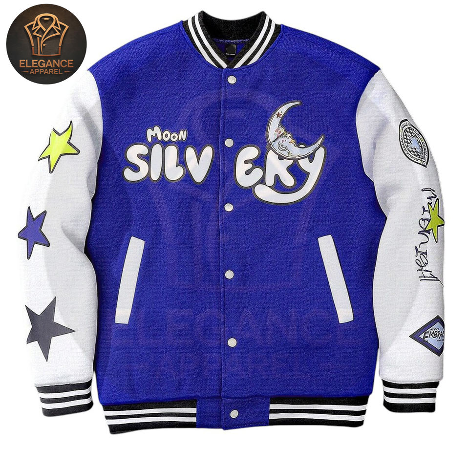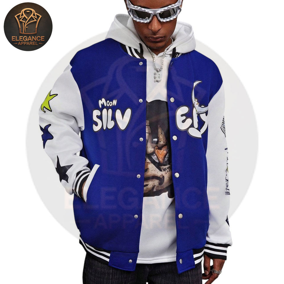 เสื้อแจ็คเก็ตทีมเบสบอลสำหรับผู้ชายเสื้อลายดวงจันทร์และตัวอักษรภาษาอังกฤษใหม่ล่าสุดสีตัดกันสีขาวน้ำเงินฤดูใบไม้ร่วงฤดูหนาว