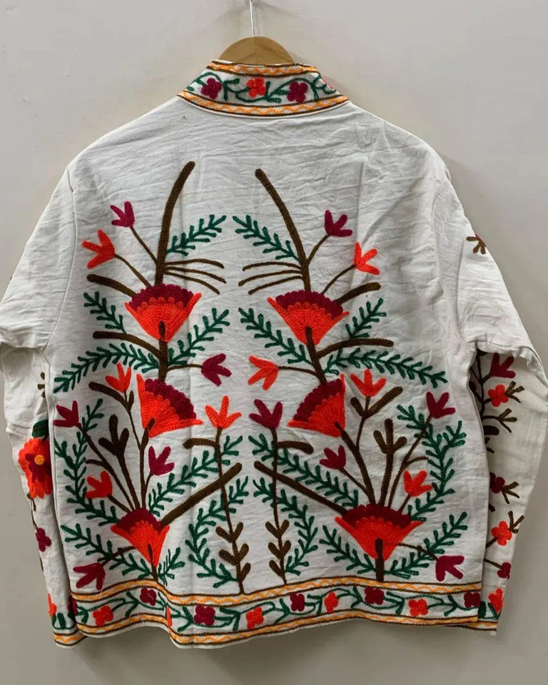 Suzani เสื้อแจ็คเก็ตผ้าฝ้ายปักลายดอกไม้กันลมและระบายอากาศได้ดีสีขาวสไตล์โบฮีเมียน