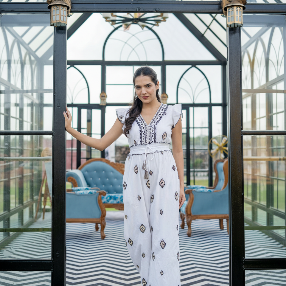 จั๊มพ์สูทปักลายสไตล์โบฮีเมียนสีขาวสำหรับผู้หญิง คอวี แขนระบาย ชุดรอมเปอร์ฤดูร้อน สไตล์โบฮีเมียน ชุดใส่เที่ยวพักผ่อน สีขาว ปักลายสไตล์โบฮีเมียนสีขาว