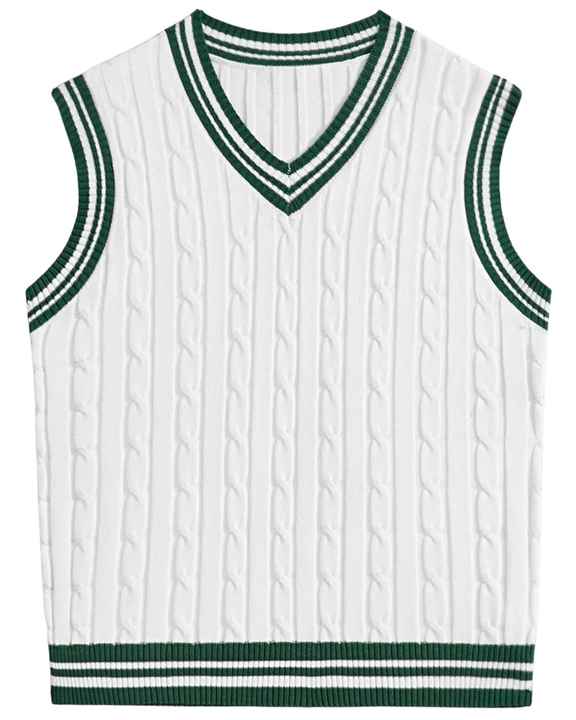 เสื้อกั๊กไหมพรมถักสีขาว แขนกุด แต่งแถบสีเขียว คอวี แบบคลาสสิก เสื้อไหมพรมถักสำหรับฤดูหนาว สำหรับผู้ชาย