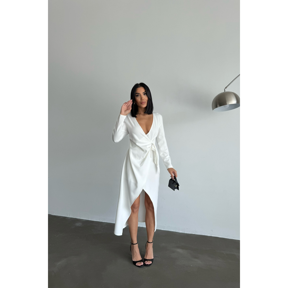 ชุดเดรสสีขาวสไตล์คลุมไหล่ ดีไซน์หรูหรา พร้อมเข็มกลัดตกแต่ง
