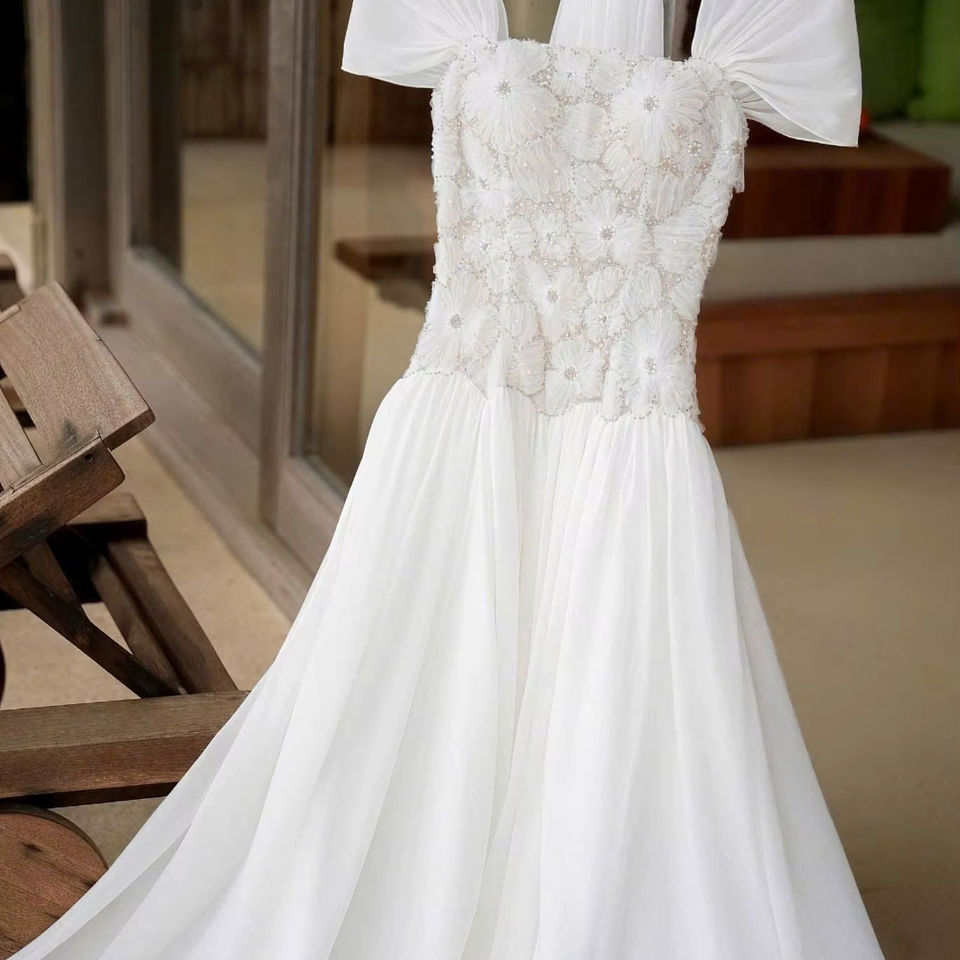 ชุดราตรีทรงฝักคอสี่เหลี่ยมผ้าชีฟองปักลายดอกไม้สำหรับงานแต่งงานงานพรอมงานปาร์ตี้