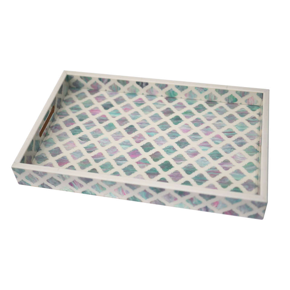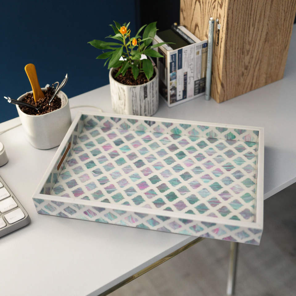 ถาดเสิร์ฟพับได้สีขาวคลาสสิก ดีไซน์เรขาคณิตลายโมเสคสีเขียว ตกแต่งห้องนั่งเล่นและโต๊ะเครื่องแป้ง