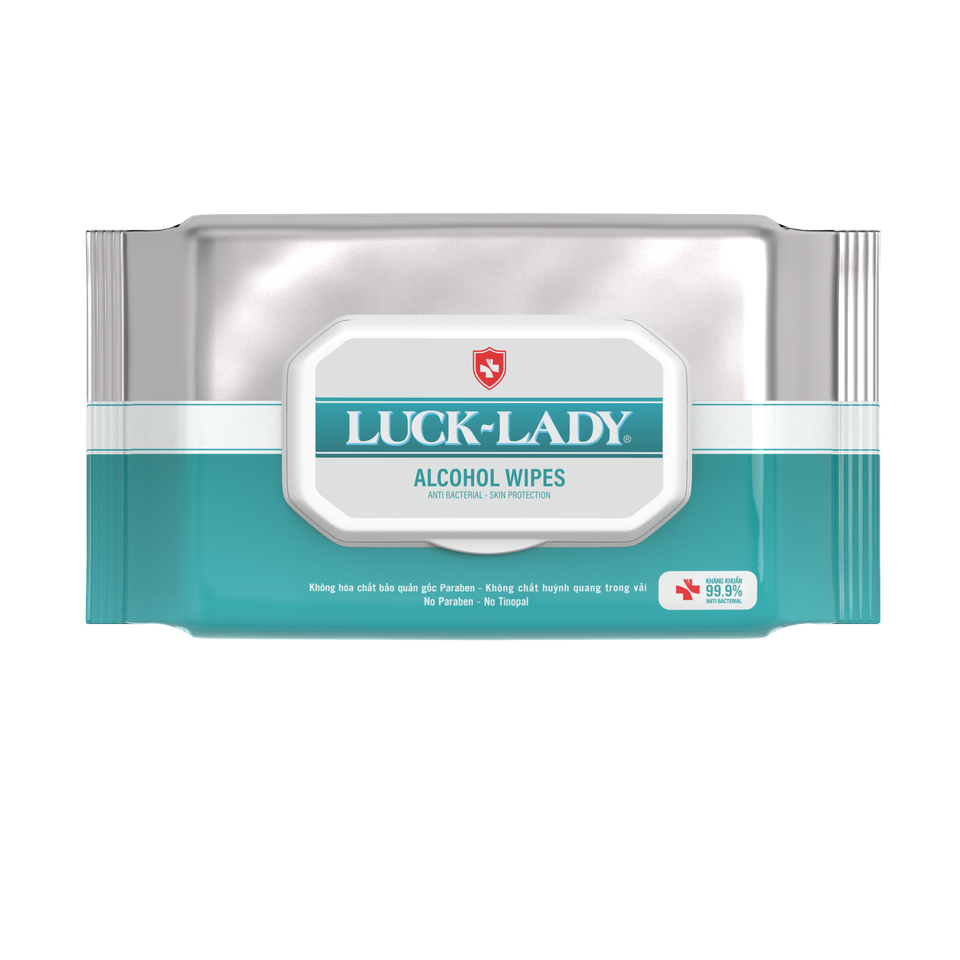 ผ้าเช็ดทำความสะอาดแบบเปียก ไวท์ คลีนนิ่ง ผลิตจากวัสดุไม่ถักทอ ผสมแอลกอฮอล์เขียว ฆ่าเชื้อโรค ผลิตในเวียดนาม ยี่ห้อลัคเลดี้ เกรดทางการแพทย์ เป็นมิตรกับสิ่งแวดล้อม พรีเมียม คุณภาพพิเศษ