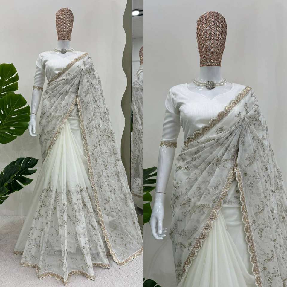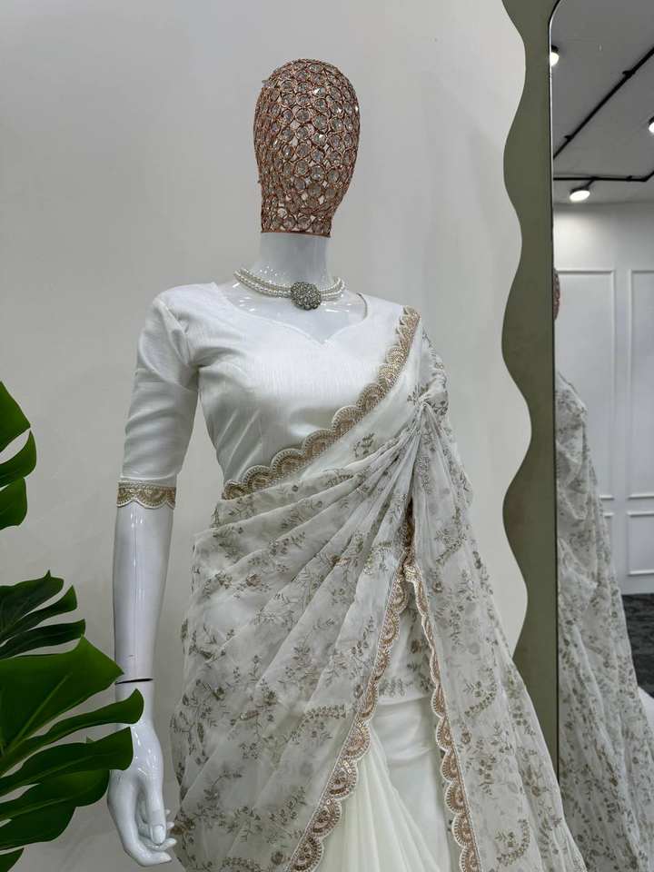 ชุดส่าหรีผ้าไหมแท้นิ่มสีขาวจากนักออกแบบชาวอินเดียเย็บปักสวยงามและเรียงตามลำดับสำหรับงานแต่งงานและงานปาร์ตี้