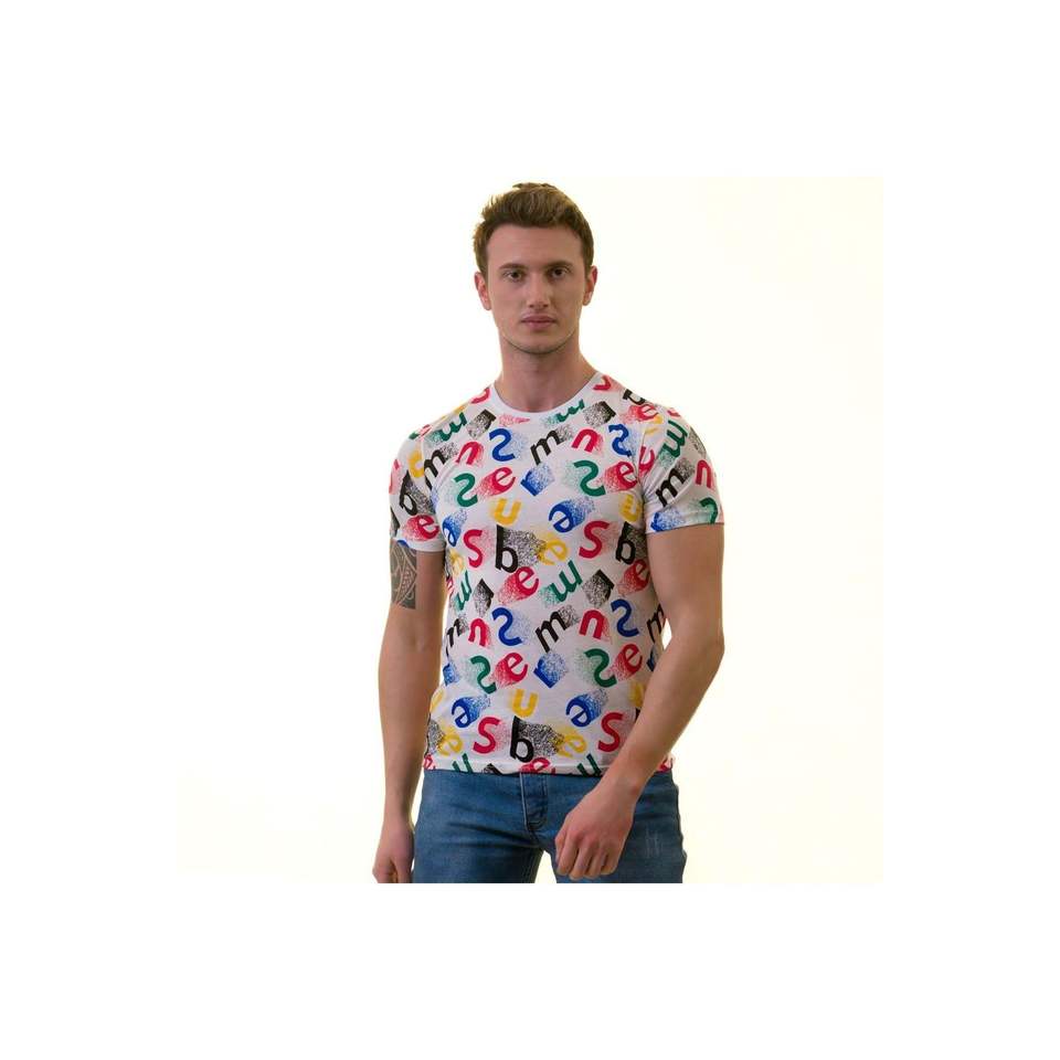 เสื้อยืดคอกลมสำหรับผู้ชายพิมพ์ลายตัวอักษรสีขาวหลากสีผ้าฝ้ายคอมบ์