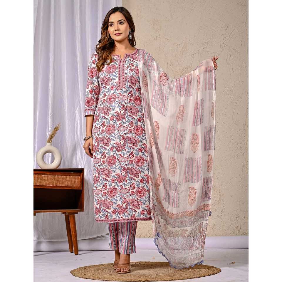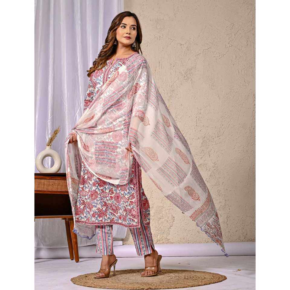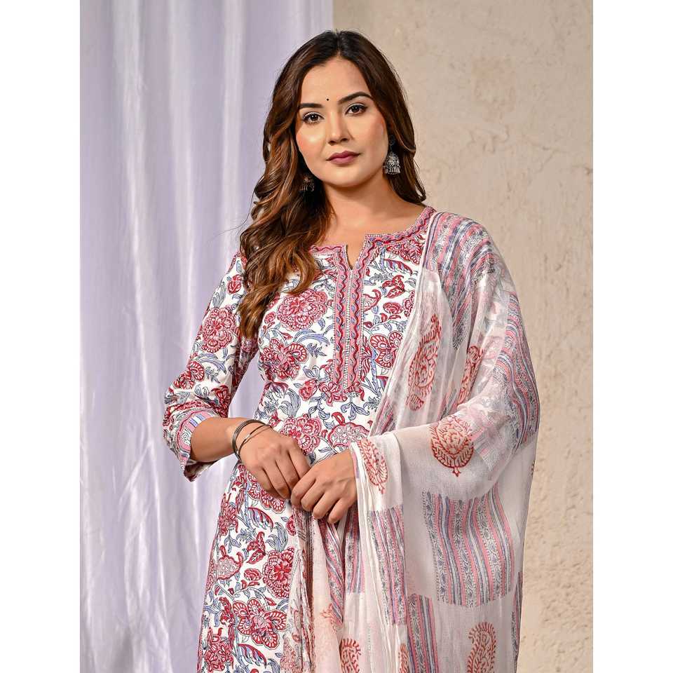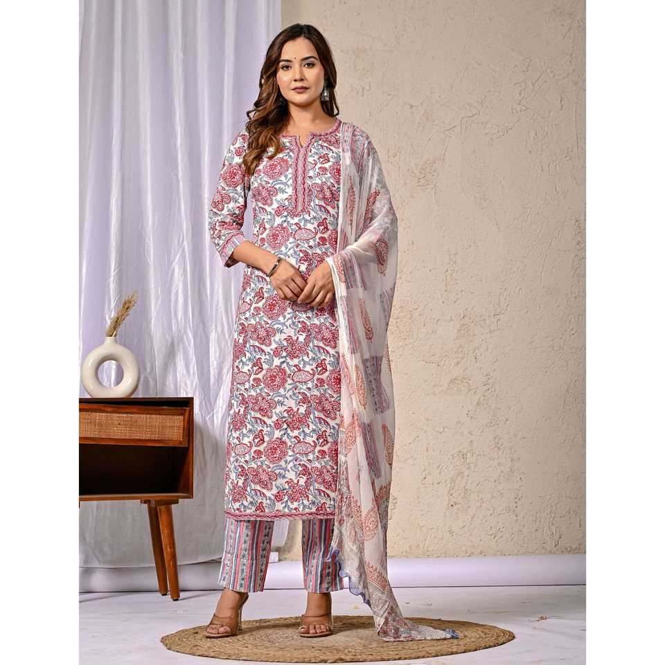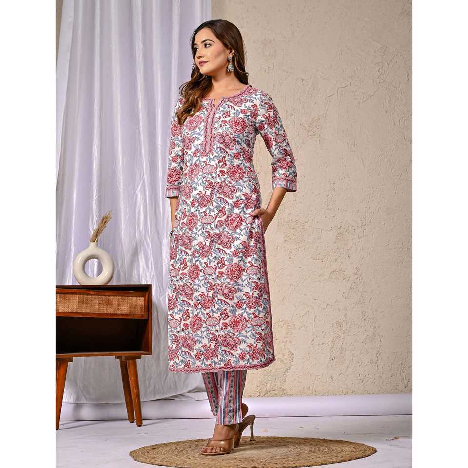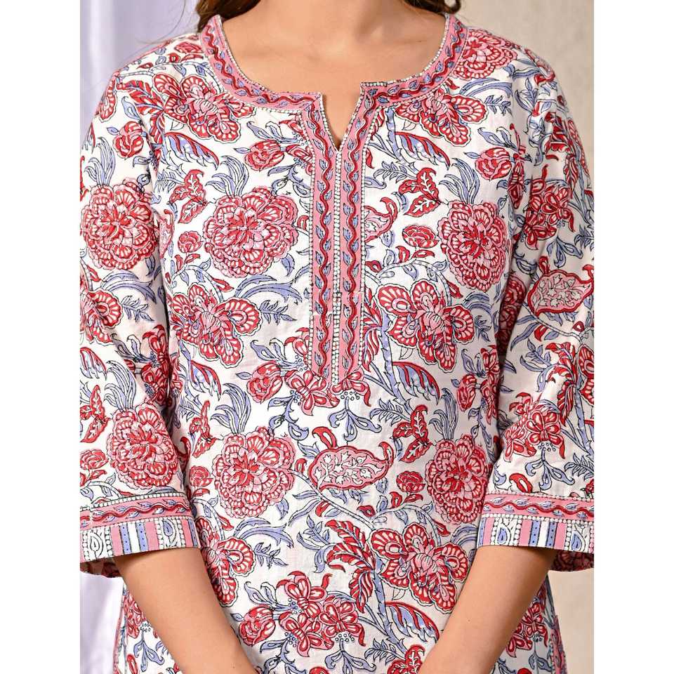 ชุดคุรตะผ้าฝ้ายสีขาวพร้อมกางเกงขายาว แขนสามส่วน ลายพิมพ์บล็อก เหมาะสำหรับใส่ในชีวิตประจำวัน