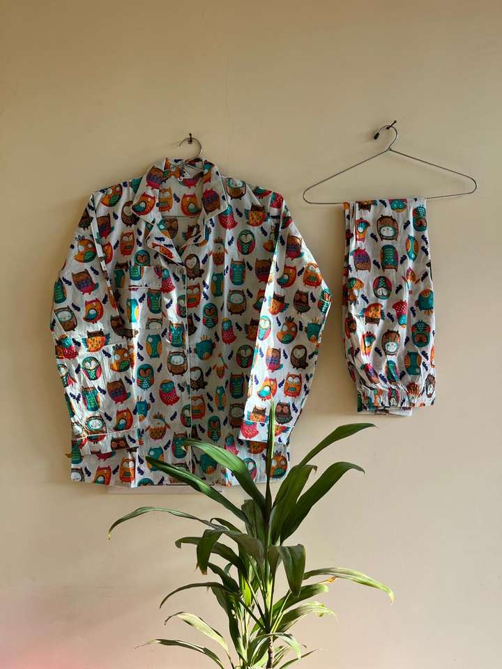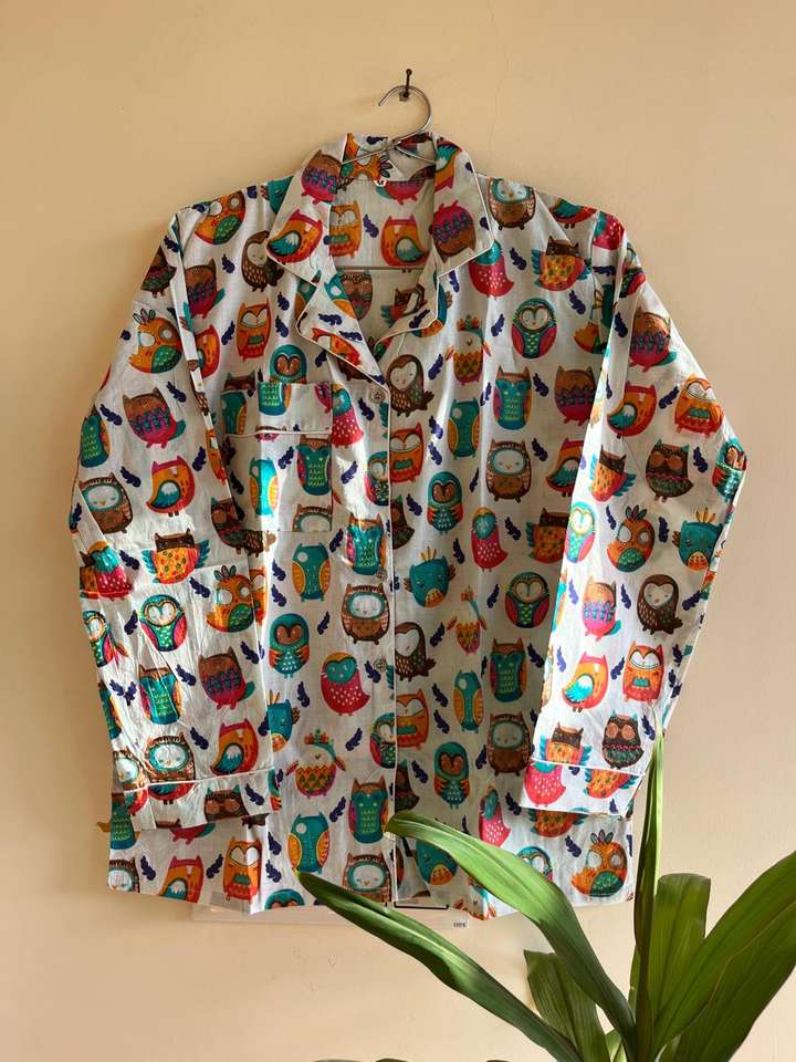 ชุดนอนแขนยาวผ้าฝ้ายออร์แกนิค 100% สีขาว พิมพ์ลายนกฮูก คอวี ปิดด้วยเชือกผูก เนื้อผ้านุ่ม ระบายอากาศดี เซ็กซี่ ไซส์ใหญ่สำหรับผู้หญิง