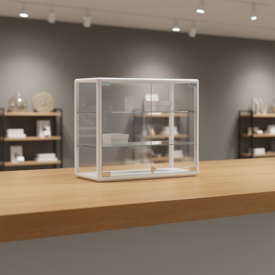 ตู้โชว์เคาน์เตอร์สีขาว 65x23x51 ซม. พร้อมกระจกนิรภัยและชั้นวางปรับระดับได้สำหรับใช้เป็นตู้โชว์