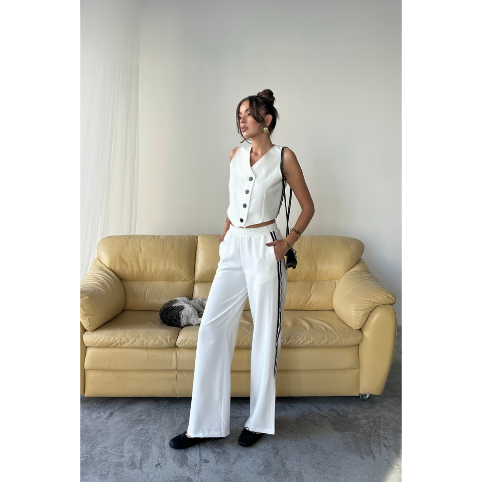ชุดเสื้อกั๊กครอปสีขาวและกางเกงขายาว - ชุดสองชิ้นสำหรับฤดูร้อนพร้อมดีเทลชายเสื้อผ่าและแถบข้าง ไซส์ XS ทรงเข้ารูป