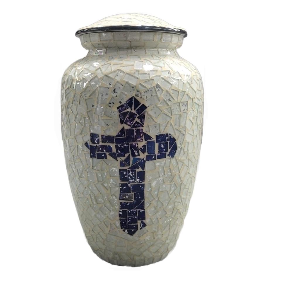 โกศโลหะสีขาวสำหรับผู้ใหญ่ใส่เถ้ากระดูกสำหรับสัตว์เลี้ยงหรือทารกวัสดุสำหรับงานศพโมเสคสีขาว