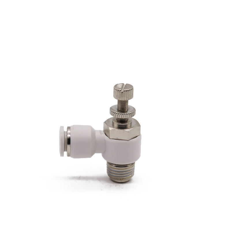 วาล์วควบคุมความเร็วทรงกระบอกสีขาวพร้อมข้อต่อเร็วแบบ L-Type รุ่น SL8-02/10-02 วาล์วควบคุมการไหลแบบทางเดียว