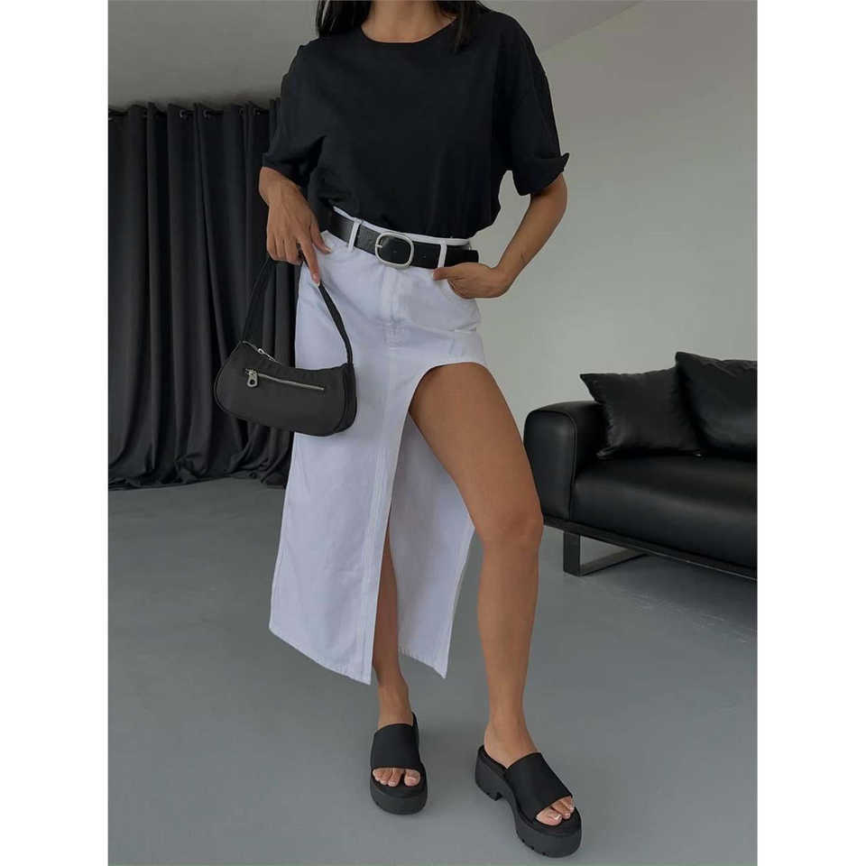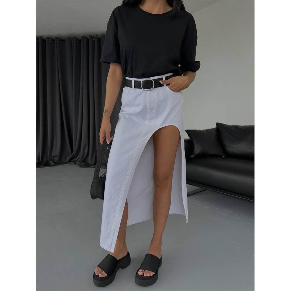 กระโปรงยีนส์สีขาวทรงเอไลน์ ความยาวปานกลาง แต่งดีเทลผ่ารูปตัวยู สไตล์ลำลอง วินเทจ เซ็กซี่ ทรงดินสอ ไซส์พลัส พร้อมเข็มขัดติดกระดุม สำหรับฤดูใบไม้ร่วง