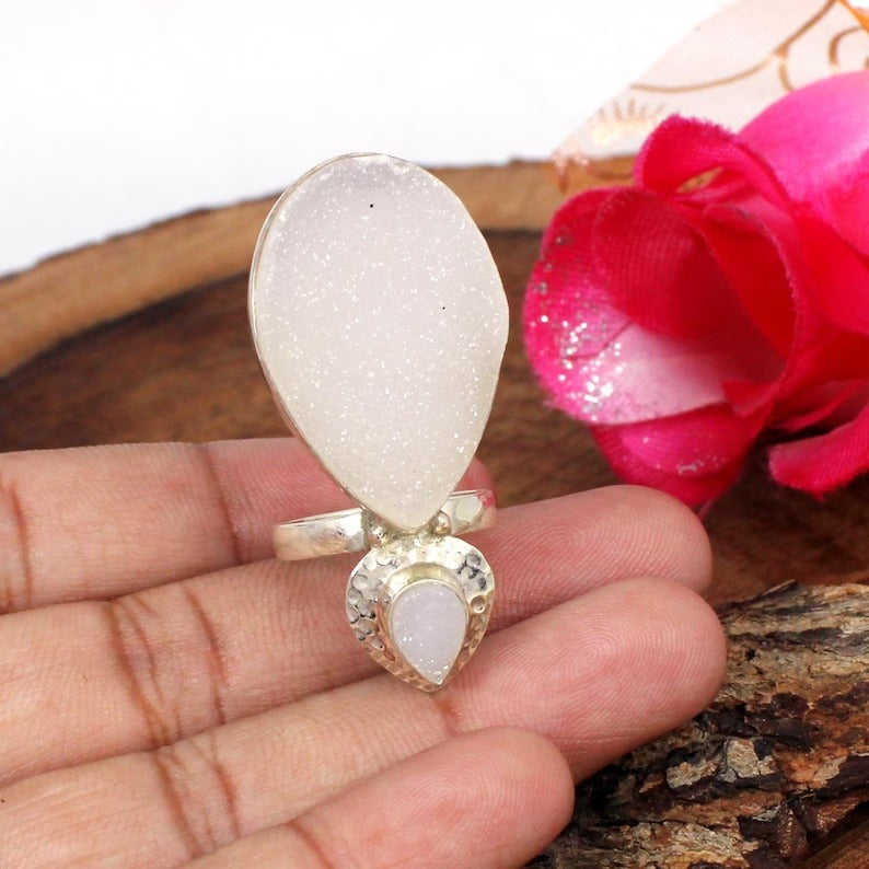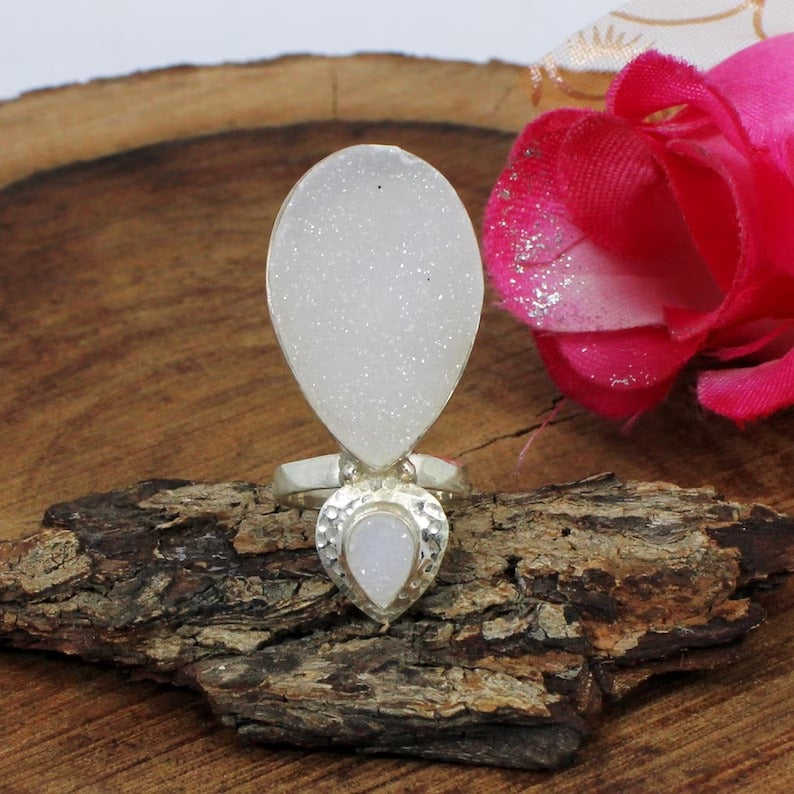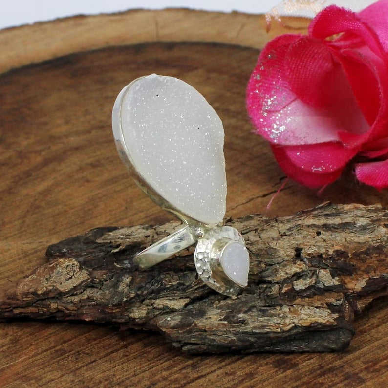 แหวนเงินแท้ประดับด้วยพลอยดรูซี่สีขาว ขนาด 30x19 มม. และ 8x6 มม. น้ำหนัก 9.34 กรัม พลอยเม็ดเดี่ยวทรงหรูหรา