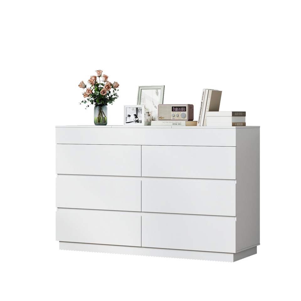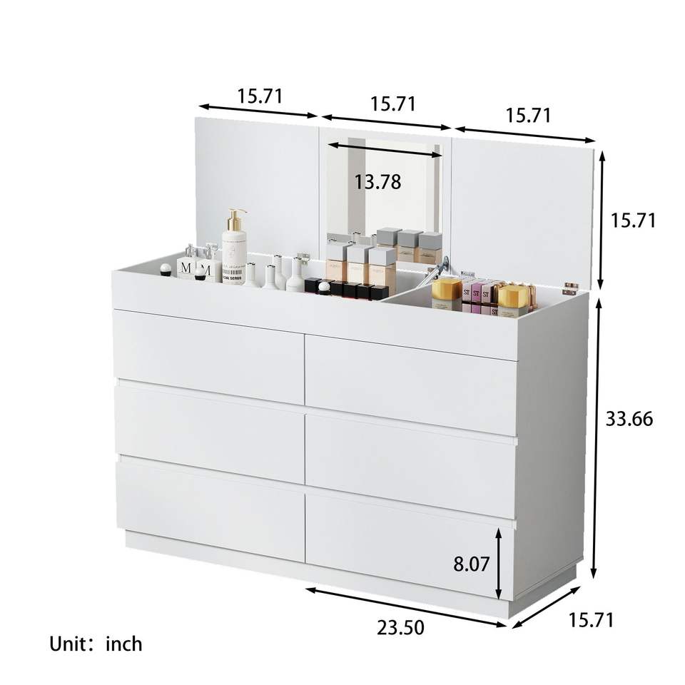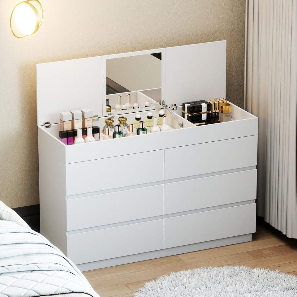 ตู้ลิ้นชักสีขาวลายนูน P2 แผ่นปาร์ติเคิลบอร์ดเคลือบเมลามีน ขนาด 120*40*85.5 ซม. พร้อมกระจก 6 ลิ้นชัก หนา 12 มม.