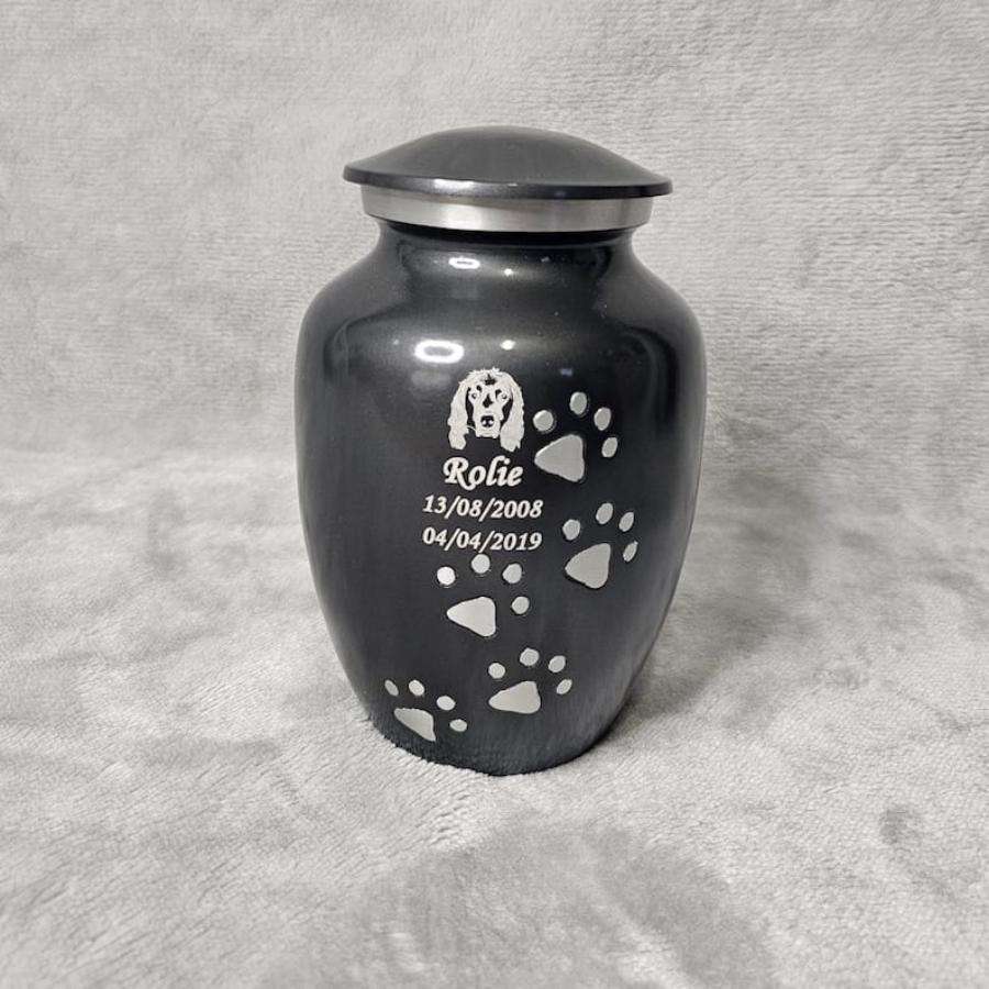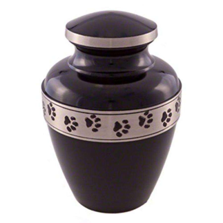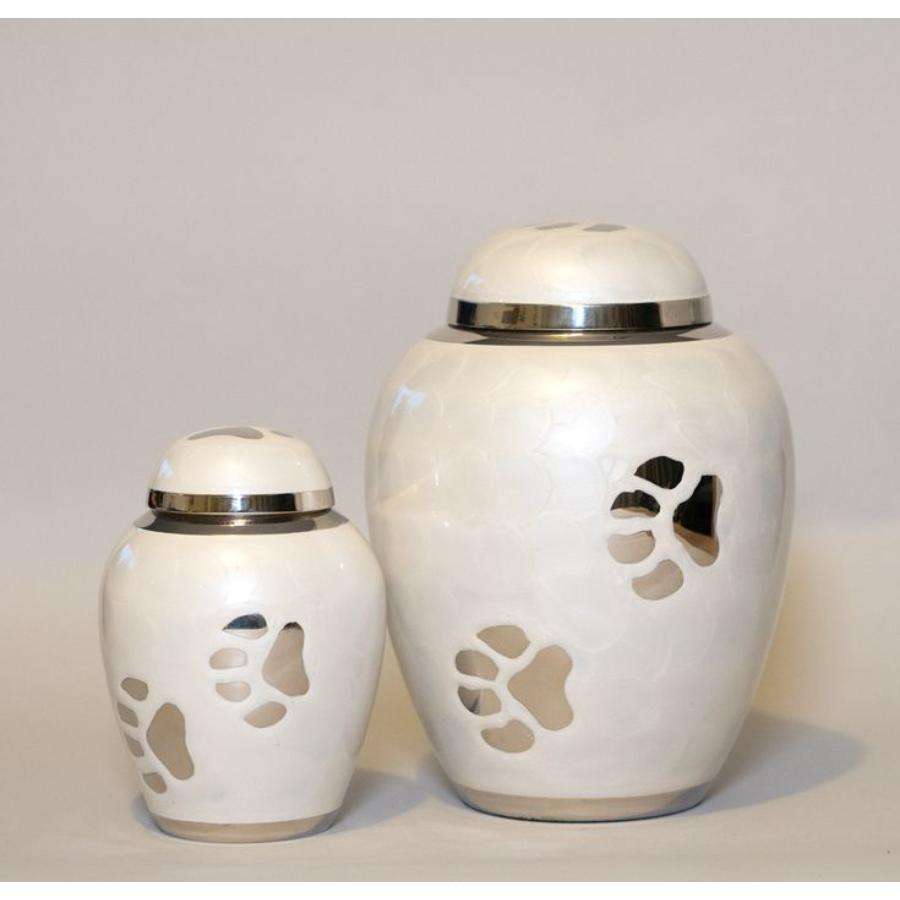 โกศเคลือบสีขาวสำหรับใส่เถ้ากระดูก ชุดของขวัญสำหรับงานศพ พร้อมรอยเท้าสัตว์เลี้ยงสีเงิน รูปทรงโดม
