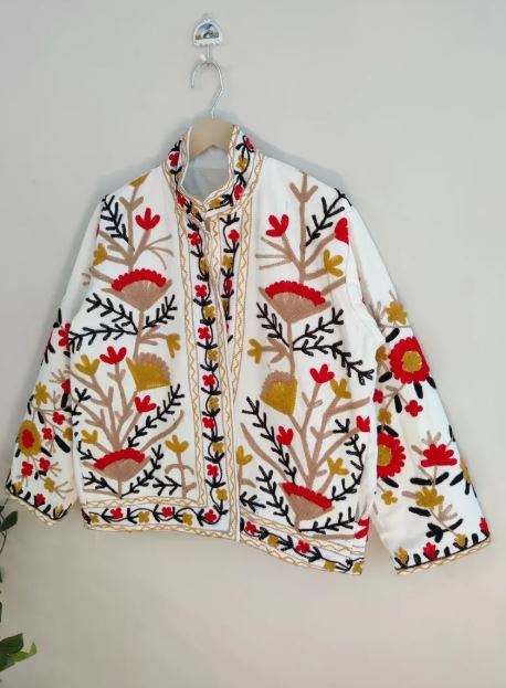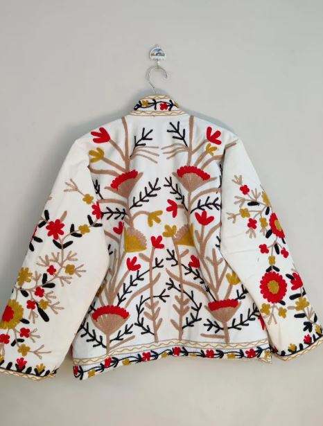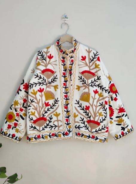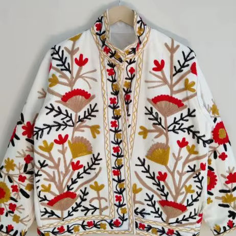 Suzani แจ็กเก็ตสไตล์พื้นเมืองผ้ากำมะหยี่ปักลายดอกไม้สีขาวสำหรับฤดูหนาวเสื้อโค้ทเทศกาลสั้นพิมพ์ลายกระดุมถักฤดูร้อน