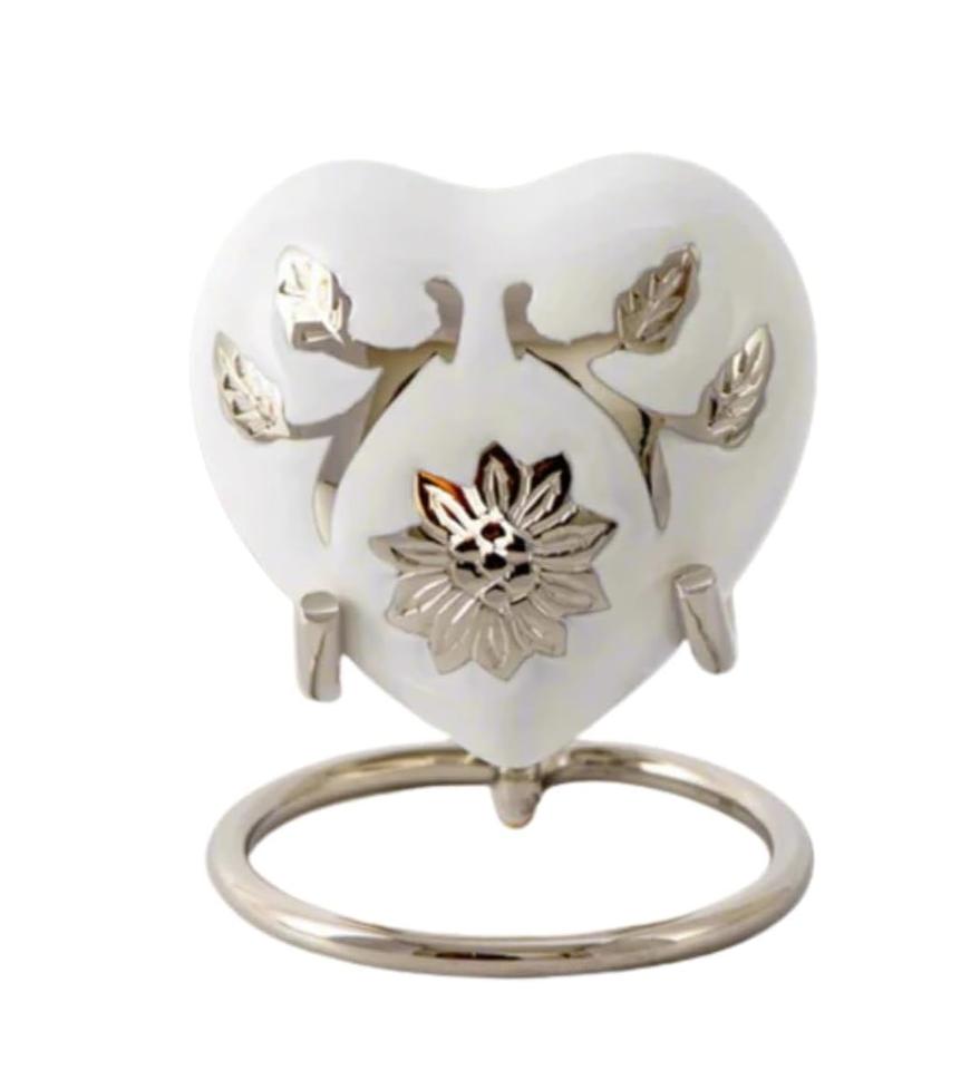 โกศแบบเรียบลายดอกไม้สีขาวสำหรับขี้เถ้าขี้เถ้าของที่ระลึกที่ระลึกใส่ของชำร่วยโกศตกแต่งรูปหัวใจทองเหลืองพร้อมขาตั้งปรับขนาดได้