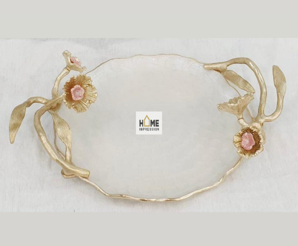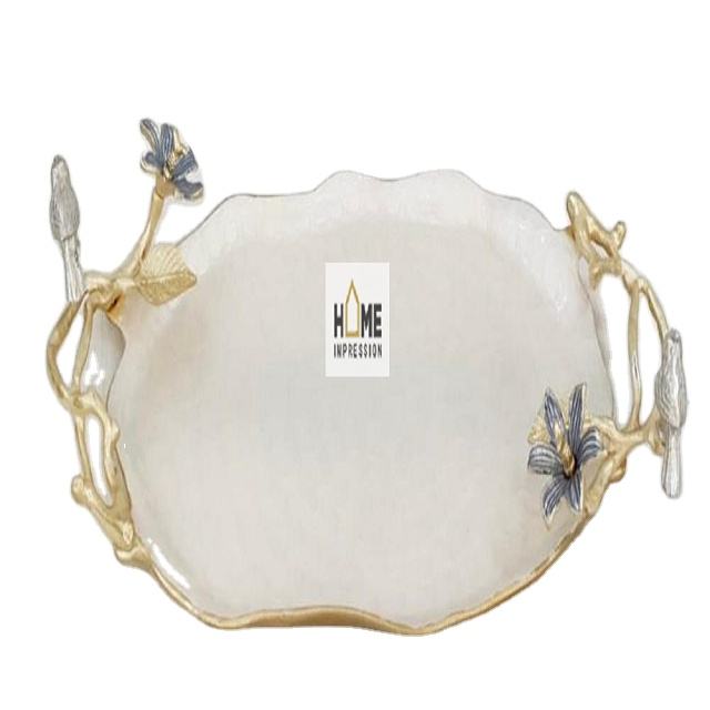 ถาดโลหะเคลือบสีขาวและสีทองสุดหรู ถาดเสิร์ฟดอกไม้ดีไซน์เนอร์