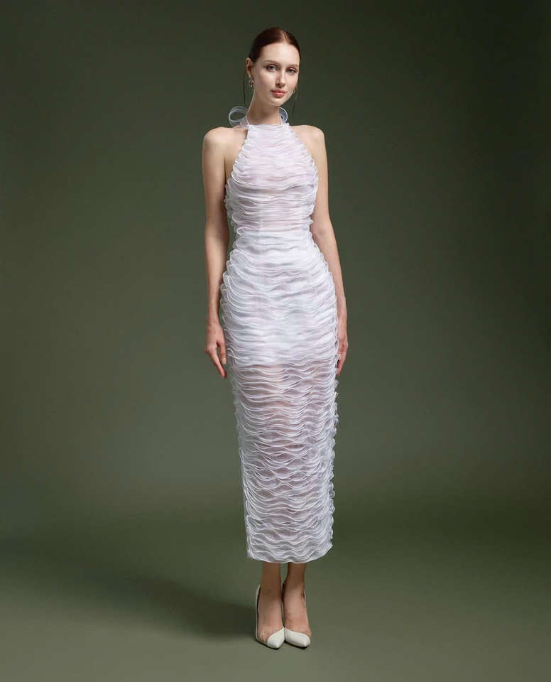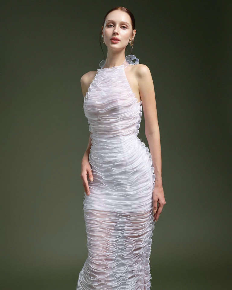 ชุดราตรีสีขาวแบบผูกคอทรงเข้ารูป แต่งผ้าซีทรูระบายเป็นลอน ดีไซน์หรูหราพิเศษ ผลิตแบบ OEM ODM ผลิตในเวียดนาม