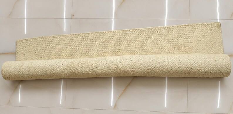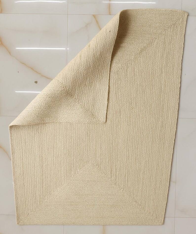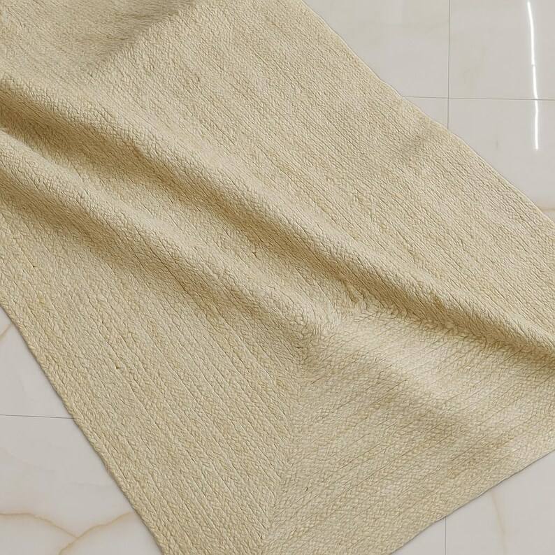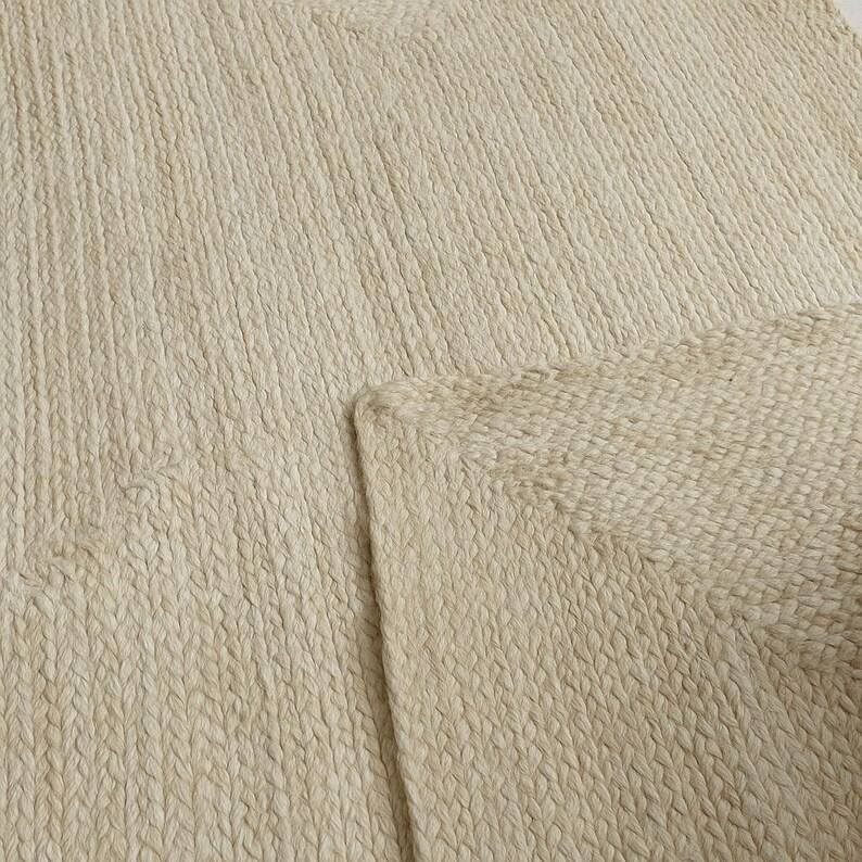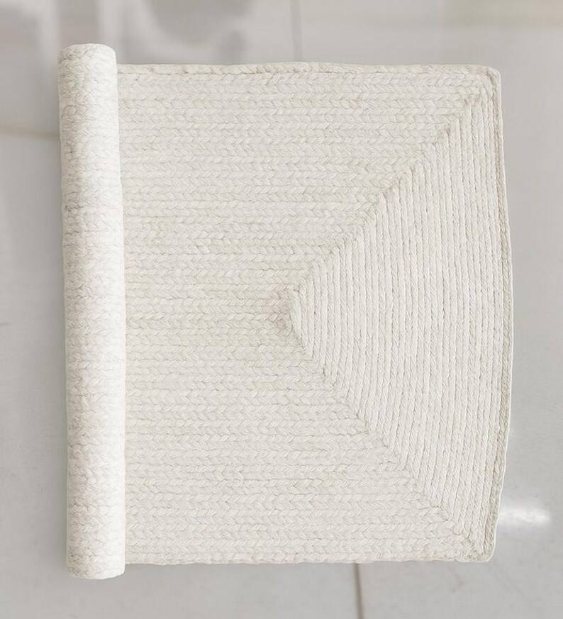 พรมปูพื้นสีขาวทอมือจากปอกระเจา สไตล์มินิมอล ลายถักแบบโบโฮ ตกแต่งพื้นห้องโทนสีกลางๆ