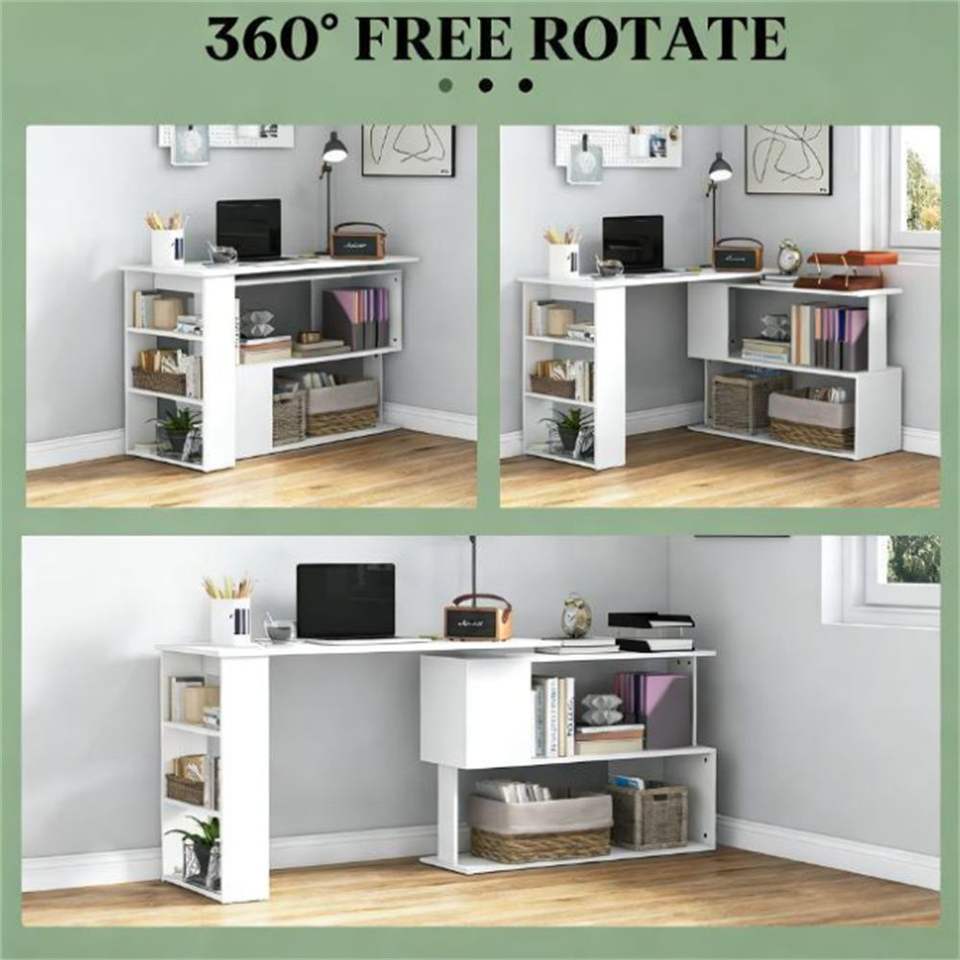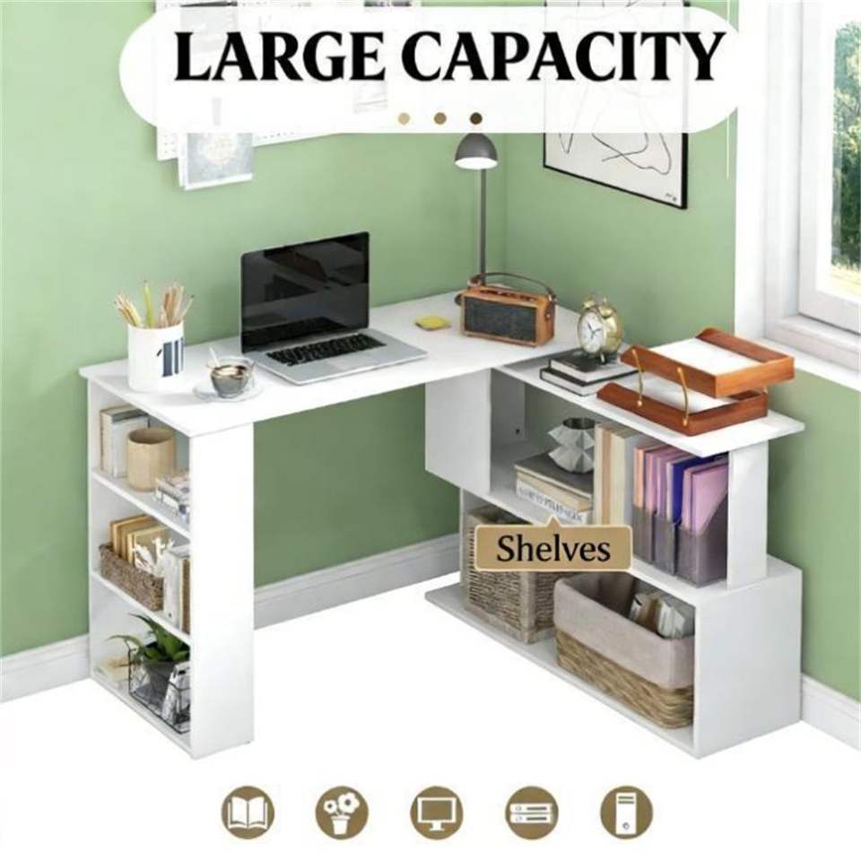 โต๊ะคอมพิวเตอร์มุมสำหรับโฮมออฟฟิศสีขาว พร้อมชั้นวางของสำหรับเขียน