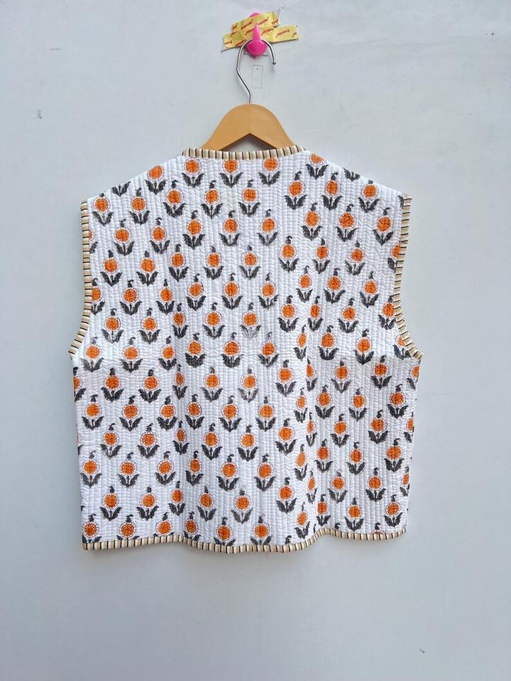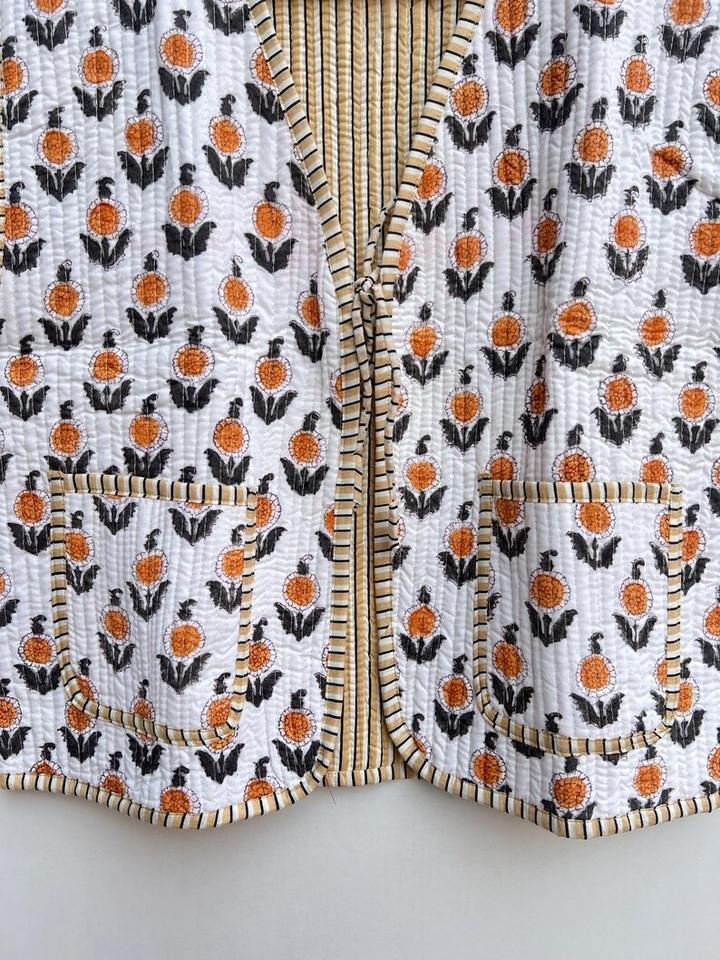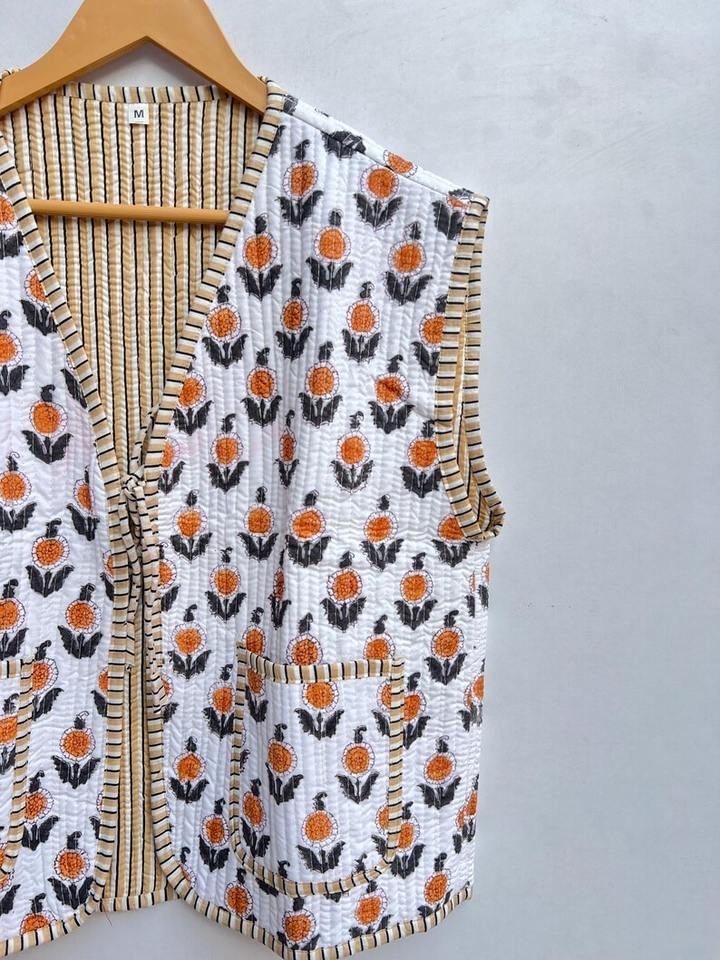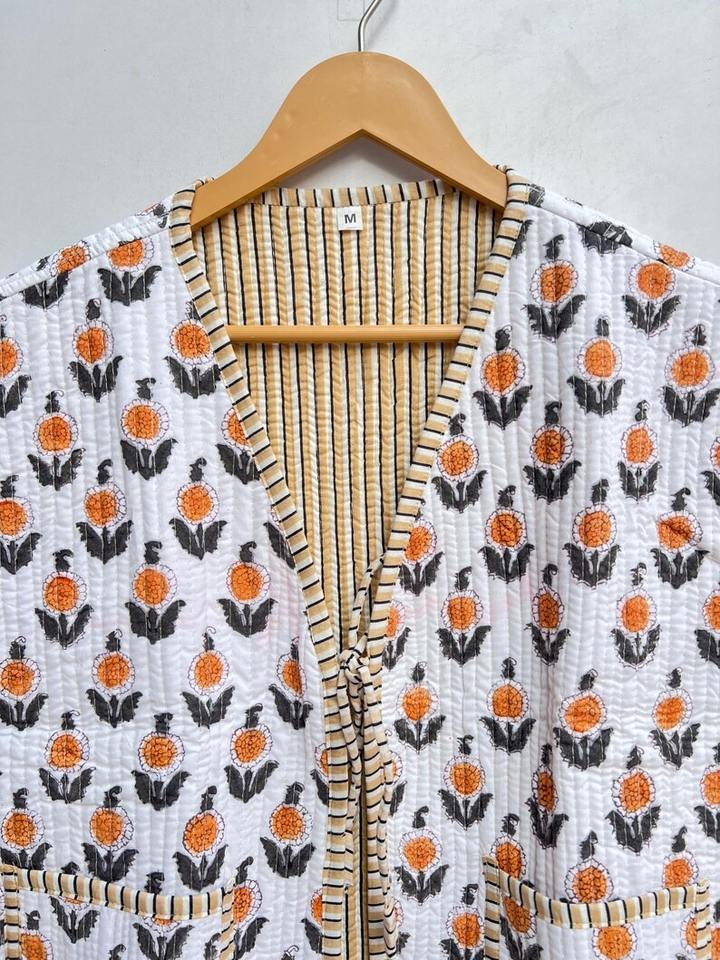 เสื้อแจ็คเก็ตผ้าฝ้ายพิมพ์ลายบล็อกทำมือสไตล์อินเดียสีขาว เสื้อกั๊กแบบโบฮีเมียน เสื้อโค้ทแบบใหม่