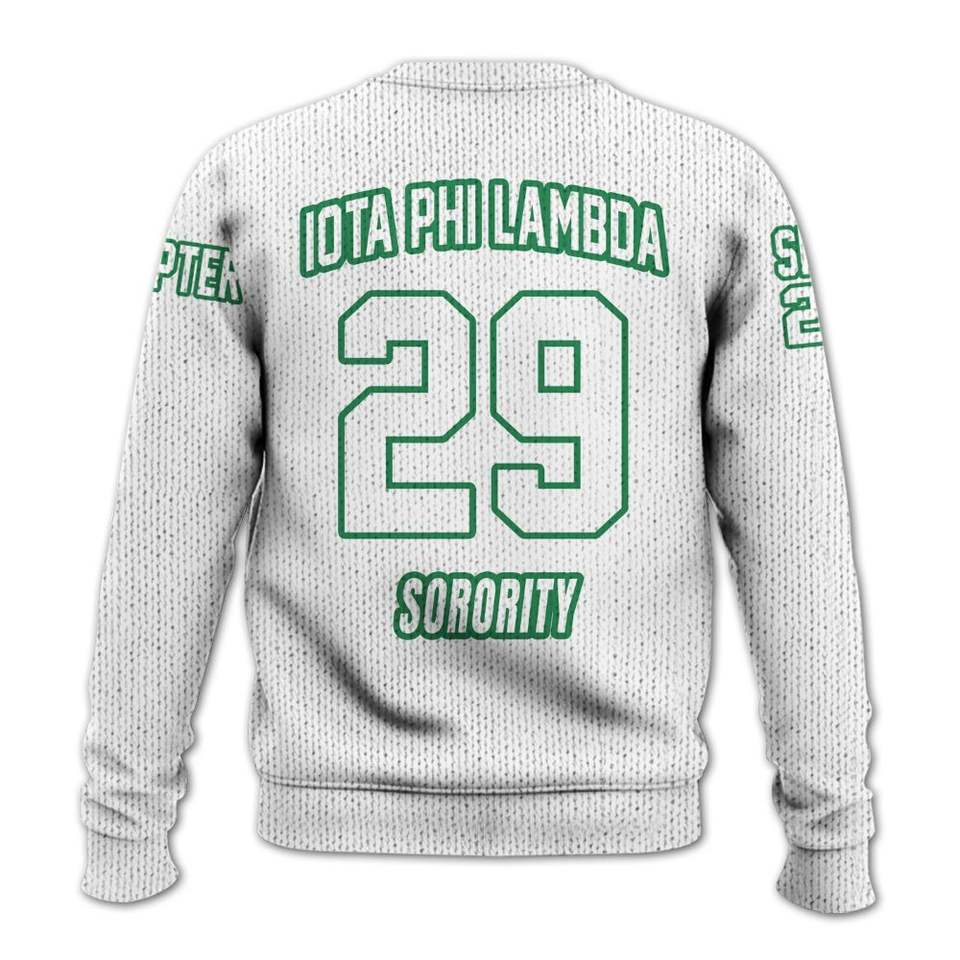 เสื้อแจ็คเก็ตวาร์ซิตี้สีขาวของ Iota Phi Lambda แบบถักนิตติ้ง สามารถปรับแต่งได้พร้อมตราสัญลักษณ์และตราประจำส่วนสำหรับสมาชิกสมาคม Iota Phi Lambda