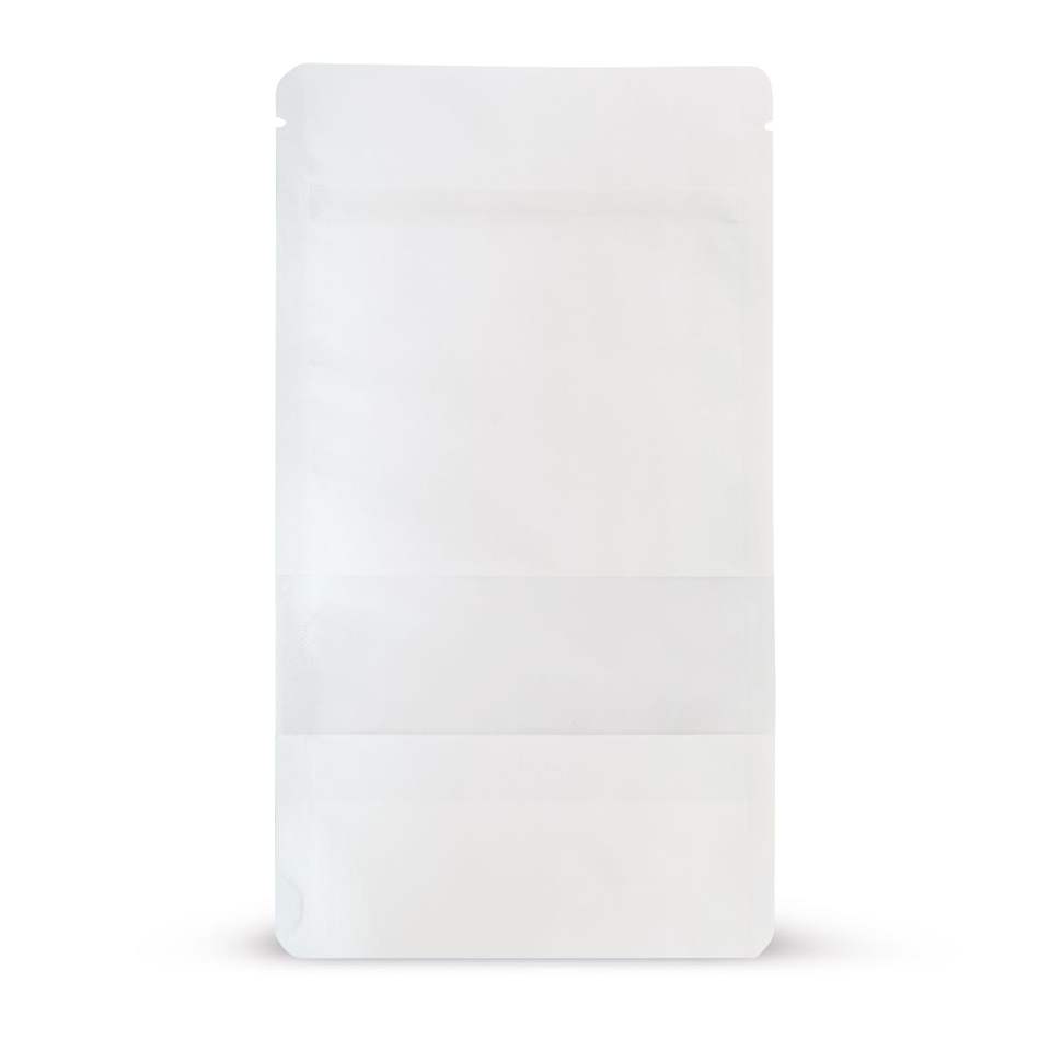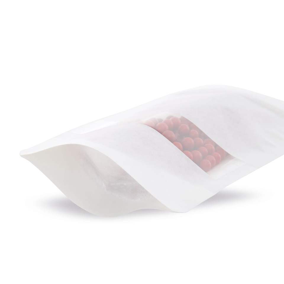 White Kraft Paper Stand-up Pouch with Window for Candy Packaging Food-Safe and Zip Closure