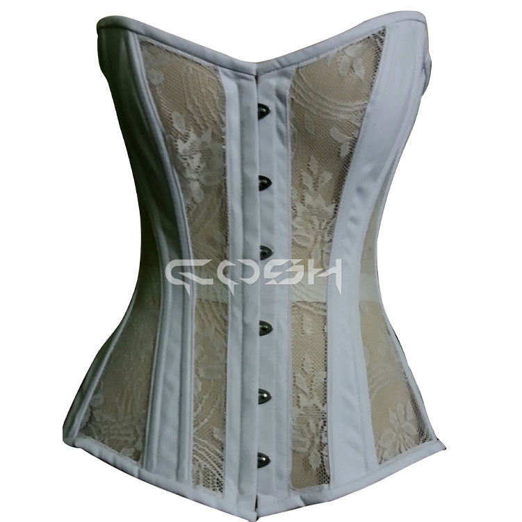 ชุดคอร์เซ็ทเจ้าสาวผ้าฝ้ายตาข่ายสีขาวแต่งลูกไม้พร้อมโครงเหล็กเสริม | ซื้อเลย