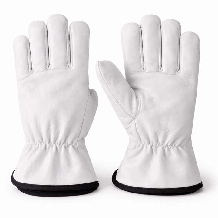 ถุงมือหนังสีขาวแบบมียางยืดที่ข้อมือ ผิวสัมผัสนุ่ม สำหรับงานอุตสาหกรรม ประกอบชิ้นส่วน และงานทั่วไป