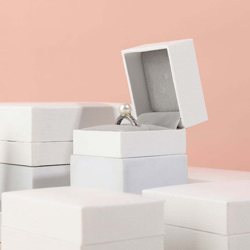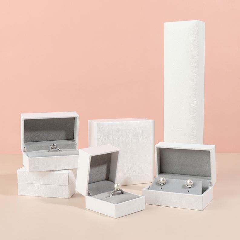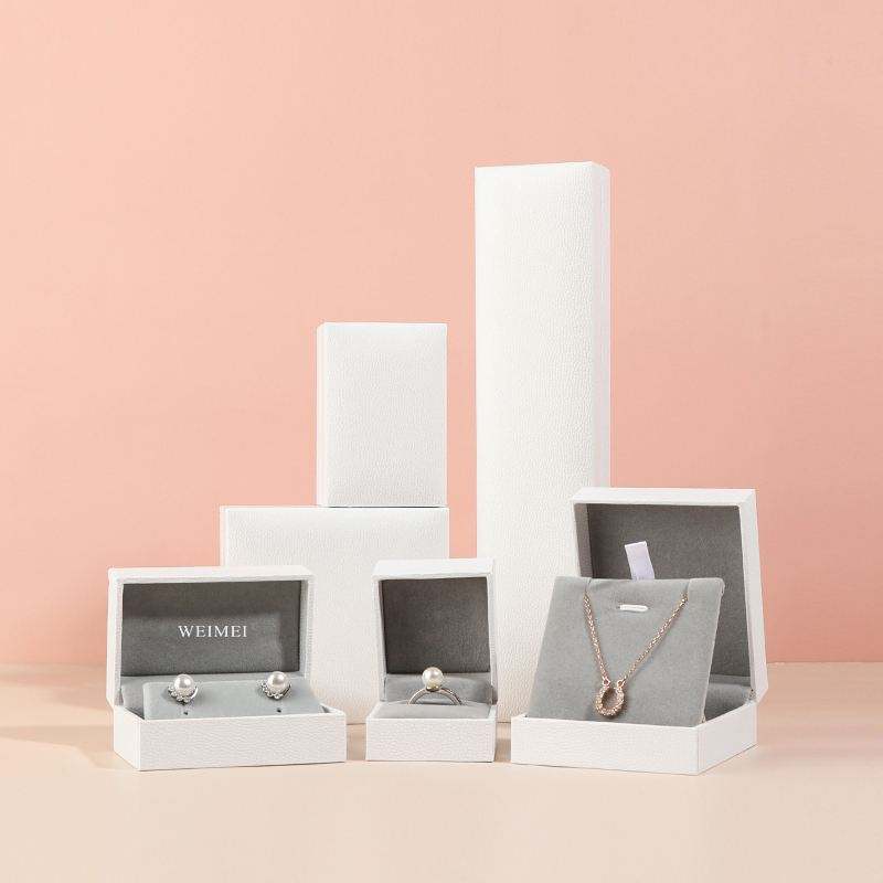 กล่องเครื่องประดับกระดาษหนังเทียมสีขาวโลโก้ OEM กล่องสี่เหลี่ยมชุดแหวนสร้อยคอต่างหูบรรจุภัณฑ์