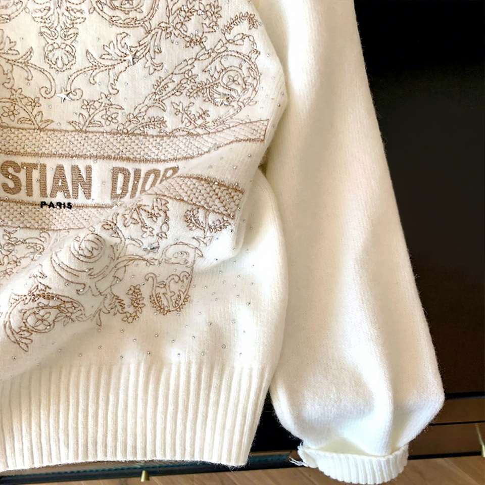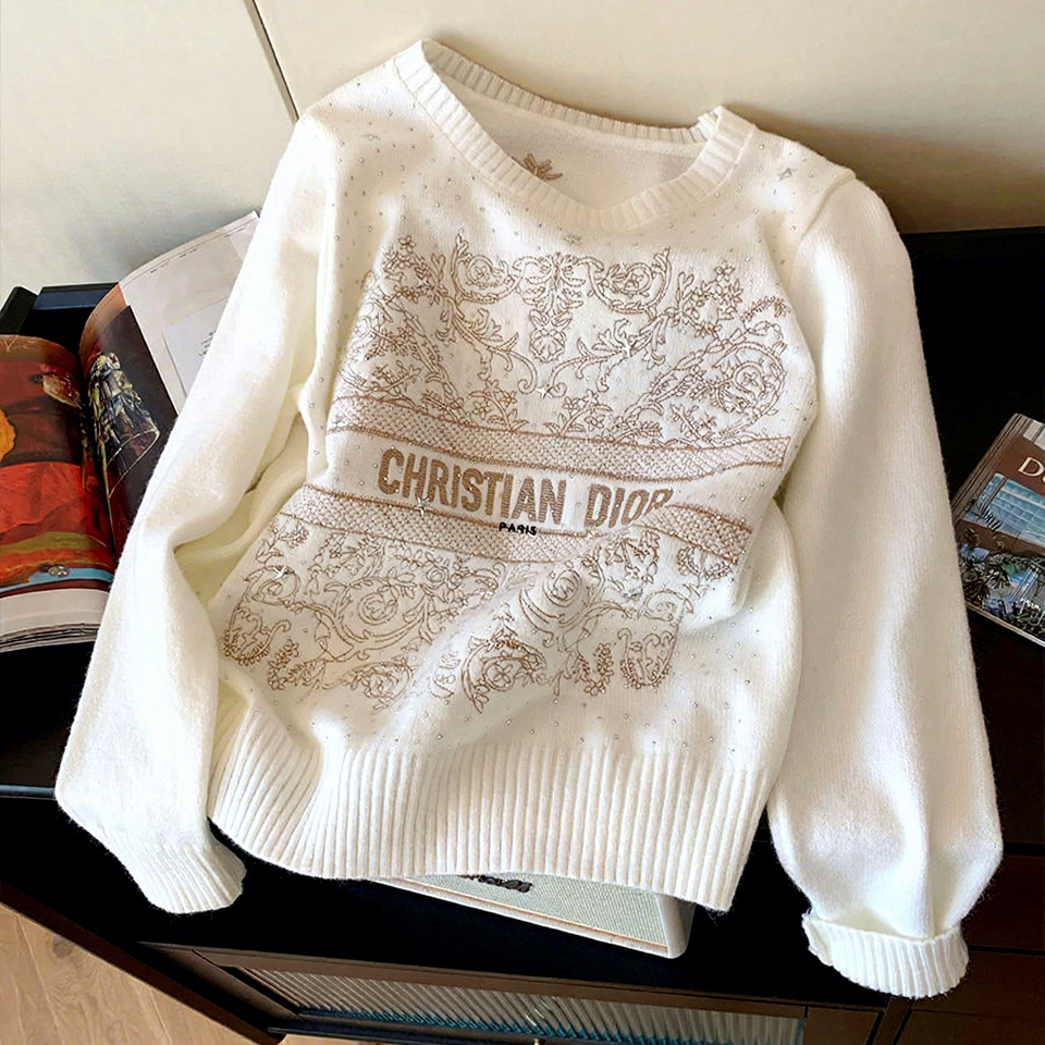 เสื้อสเวตเตอร์คอกลมปักลายตัวอักษรสีขาวประดับเพชร ผู้หญิง สไตล์หรูหรา เสื้อถักไหมพรมสำหรับฤดูหนาว เสื้อผ้าไซส์ใหญ่สำหรับผู้หญิง