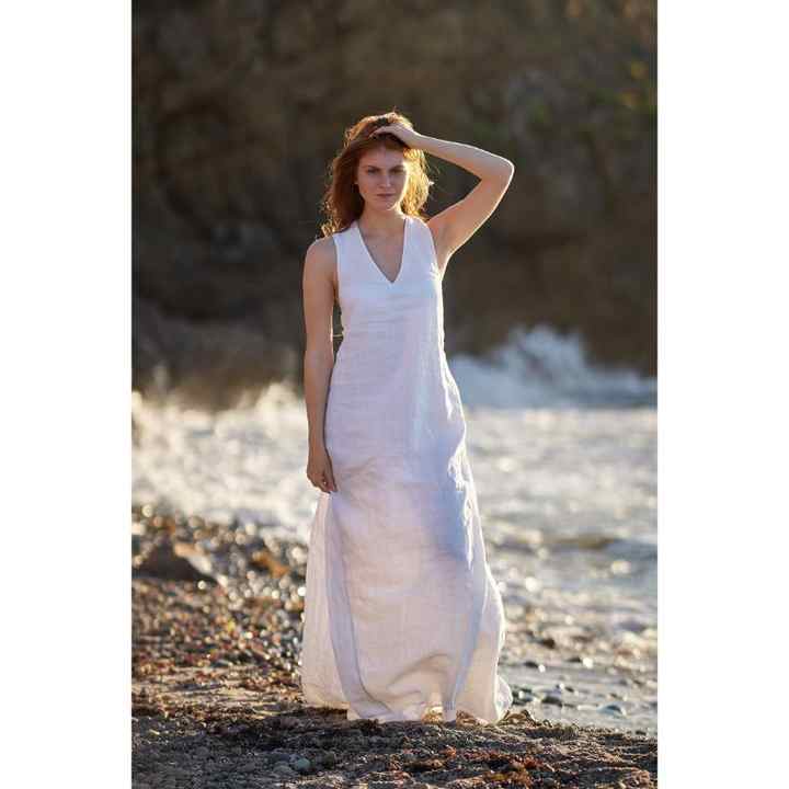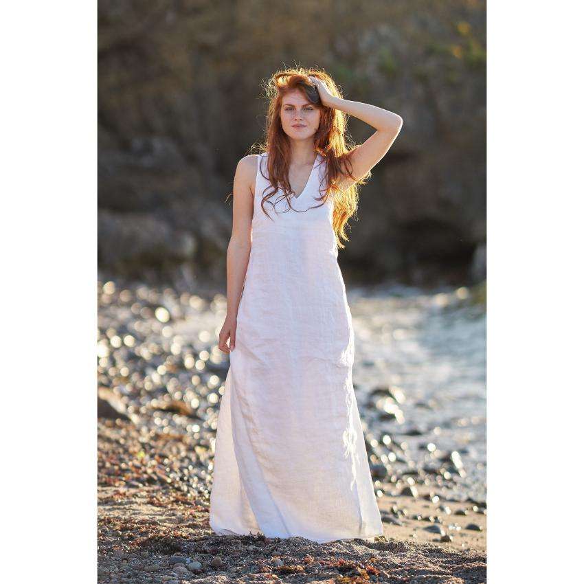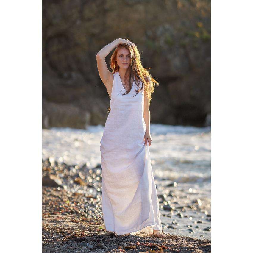ชุดเดรสผ้าลินินสีขาว แขนยาว สไตล์โบฮีเมียน สำหรับผู้หญิง เหมาะกับใส่ไปเที่ยวทะเล ฤดูร้อน เป็นมิตรกับสิ่งแวดล้อม ย้อมสีเรียบง่าย พร้อมสายผูกเอว สไตล์ลำลอง ใส่ไปรีสอร์ทได้ เอวธรรมชาติ
