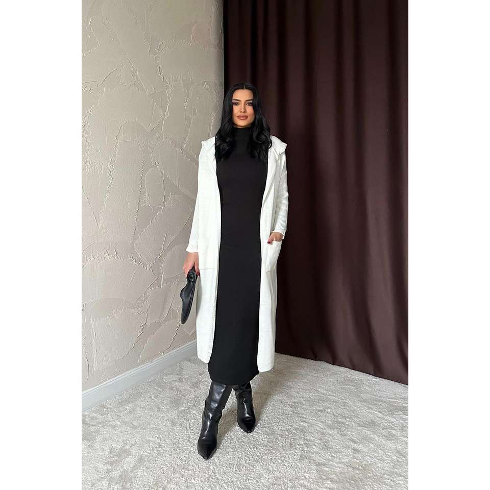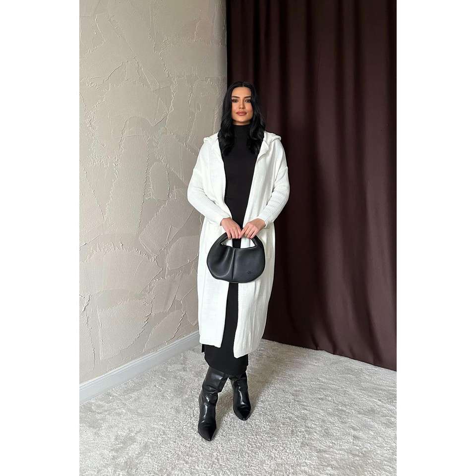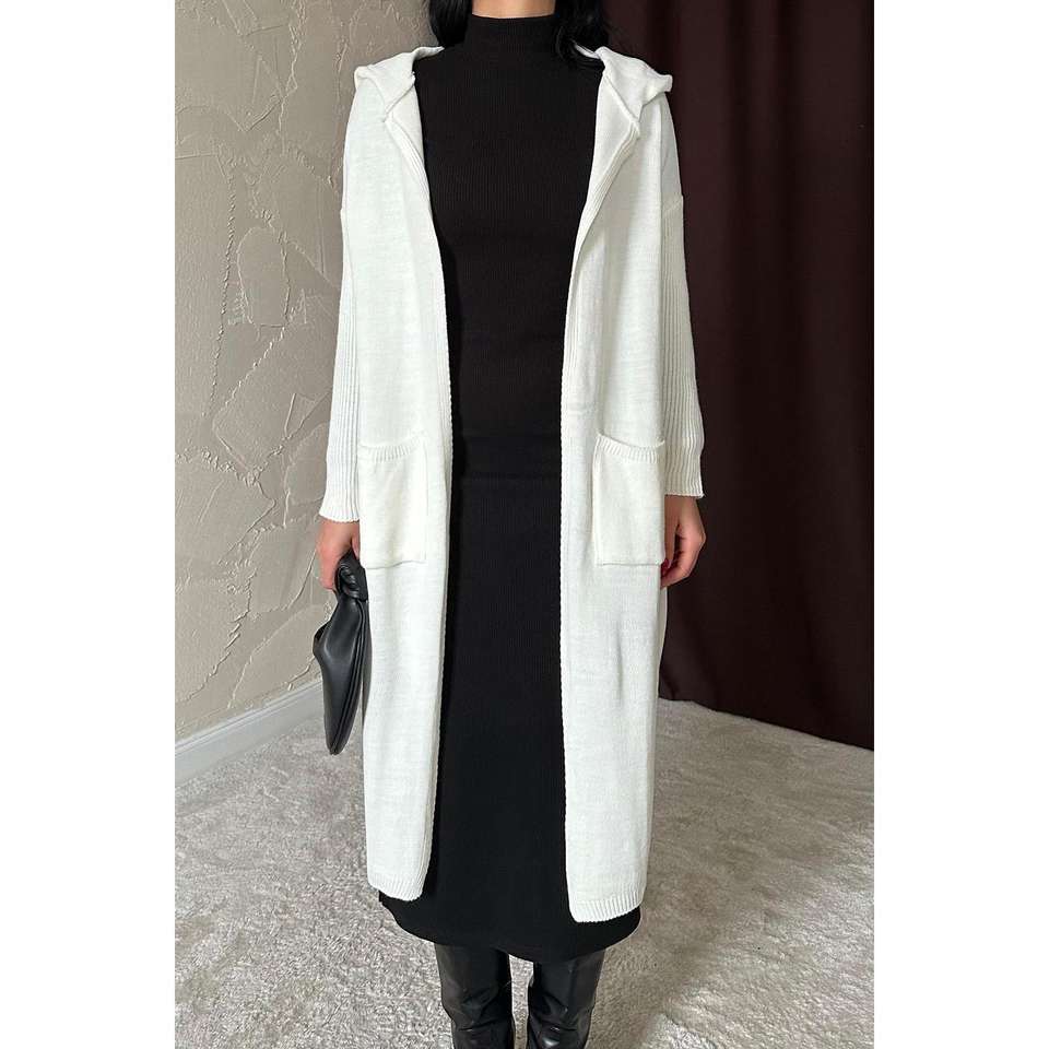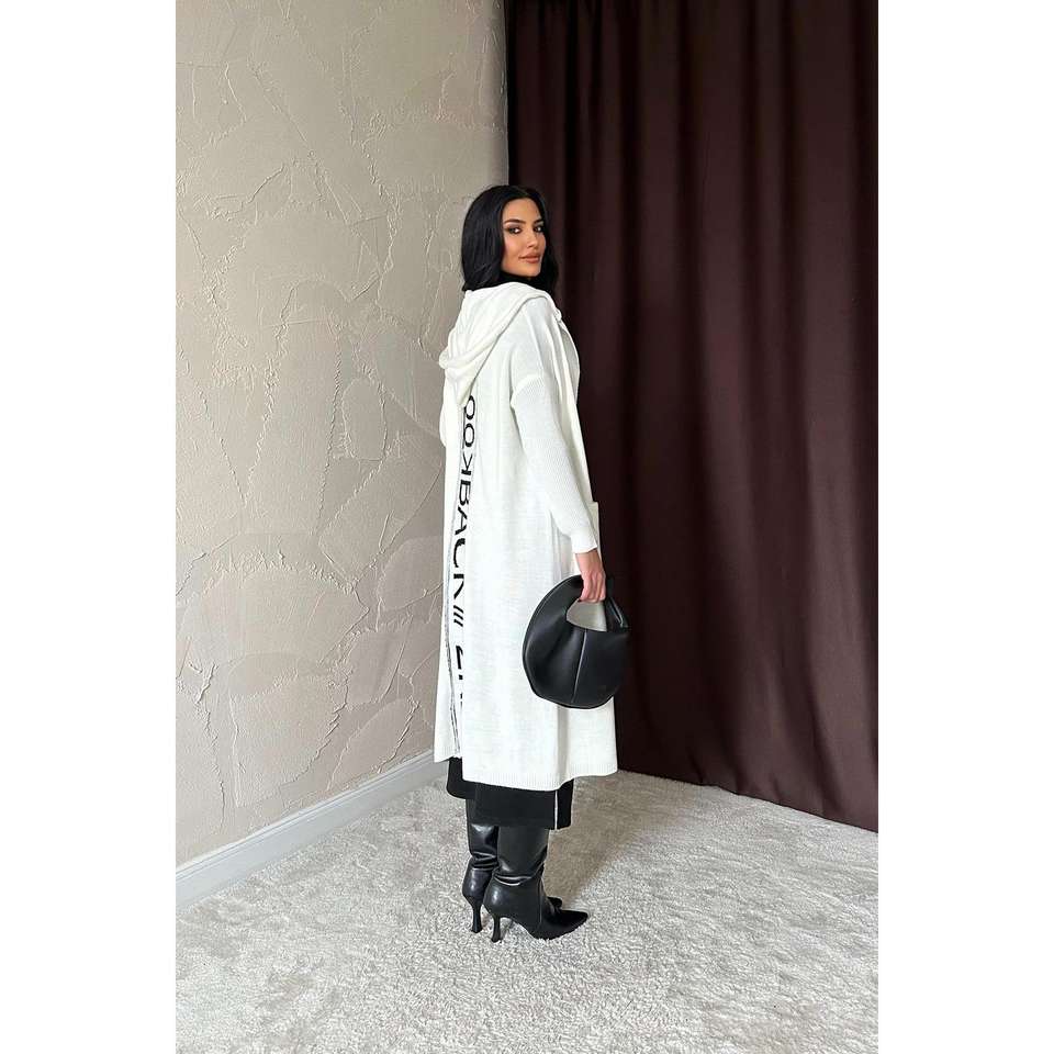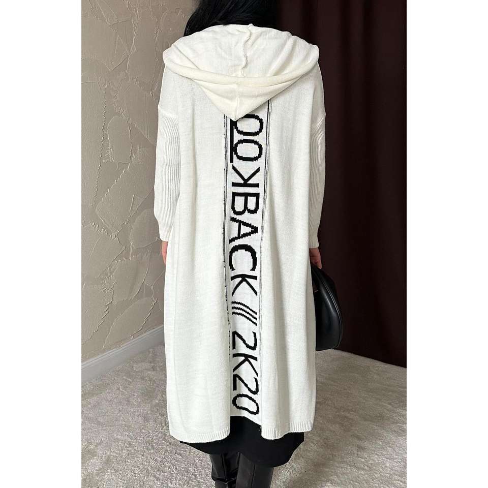 เสื้อคลุมคาร์ดิแกนถักไหมพรมสีขาวแบบยาว มีฮู้ดและลายพิมพ์ด้านหลัง สำหรับผู้หญิง สวมใส่สบาย ผ้าไม่เป็นขุย