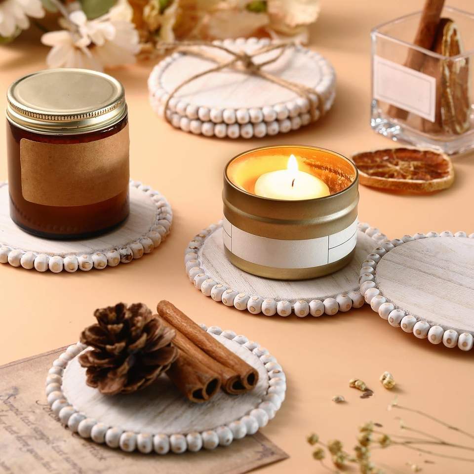 แผ่นรองแก้วไม้มะม่วงสีขาว สไตล์บ้านไร่ แบบเรียบง่าย ประดับลูกปัด ทรงกลม สไตล์โบโฮ สำหรับเครื่องดื่ม บาร์ โต๊ะกาแฟ โต๊ะครัว